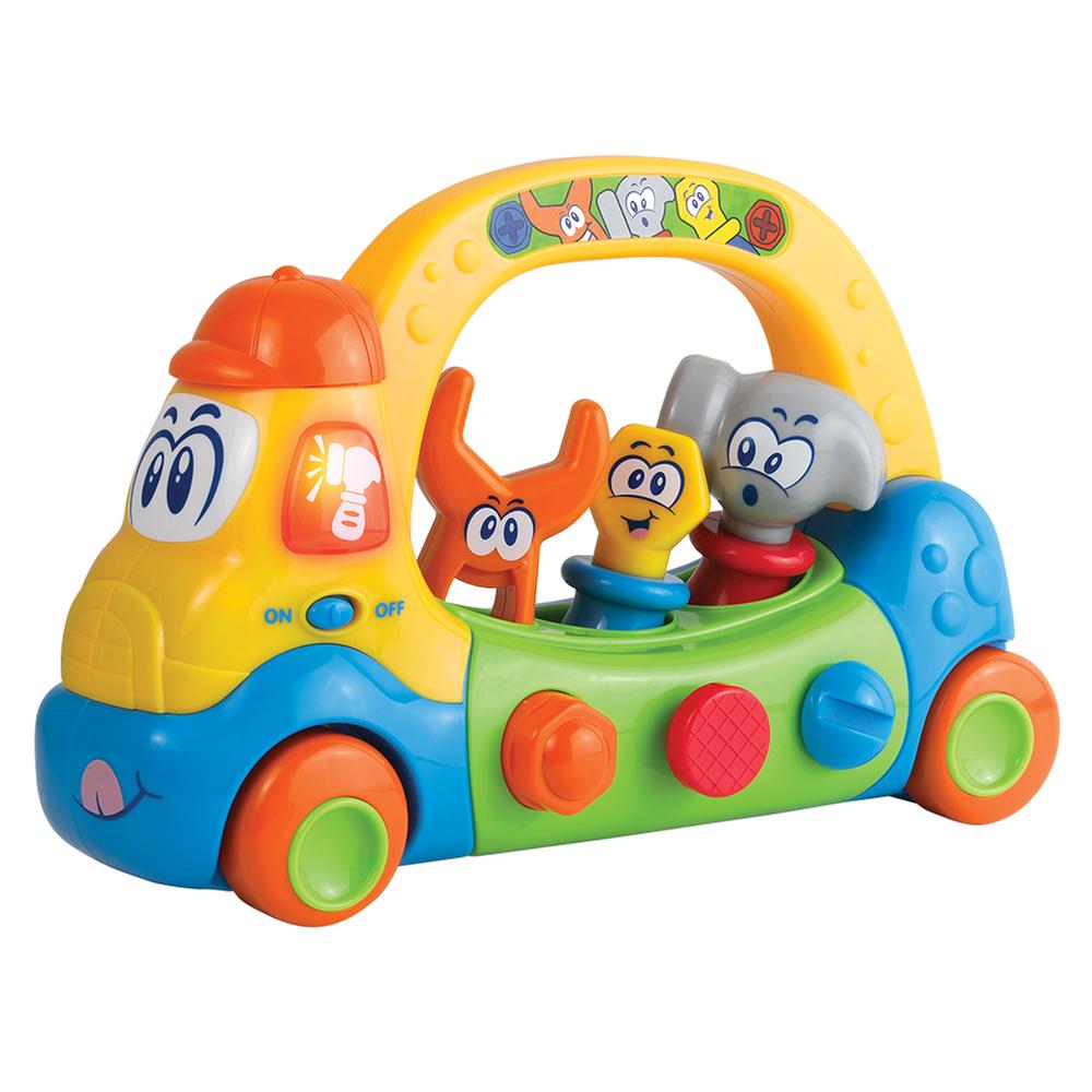 Cada momento será emocionantemente educativo con la Caja de Herramientas Musical de Baby Active. Llena de esparcimiento y aprendizaje, es el regalo idóneo para niños en crecimiento. Al presionar la parte superior de la cabecita se encenderá la luz y al usar el martillo, las pinzas o desarmador se activarán los sonidos, lo que estimula la imaginación y habilidades motoras. Además, con su asa transportadora, ¡tu pequeño podrá llevarla a todas partes!
