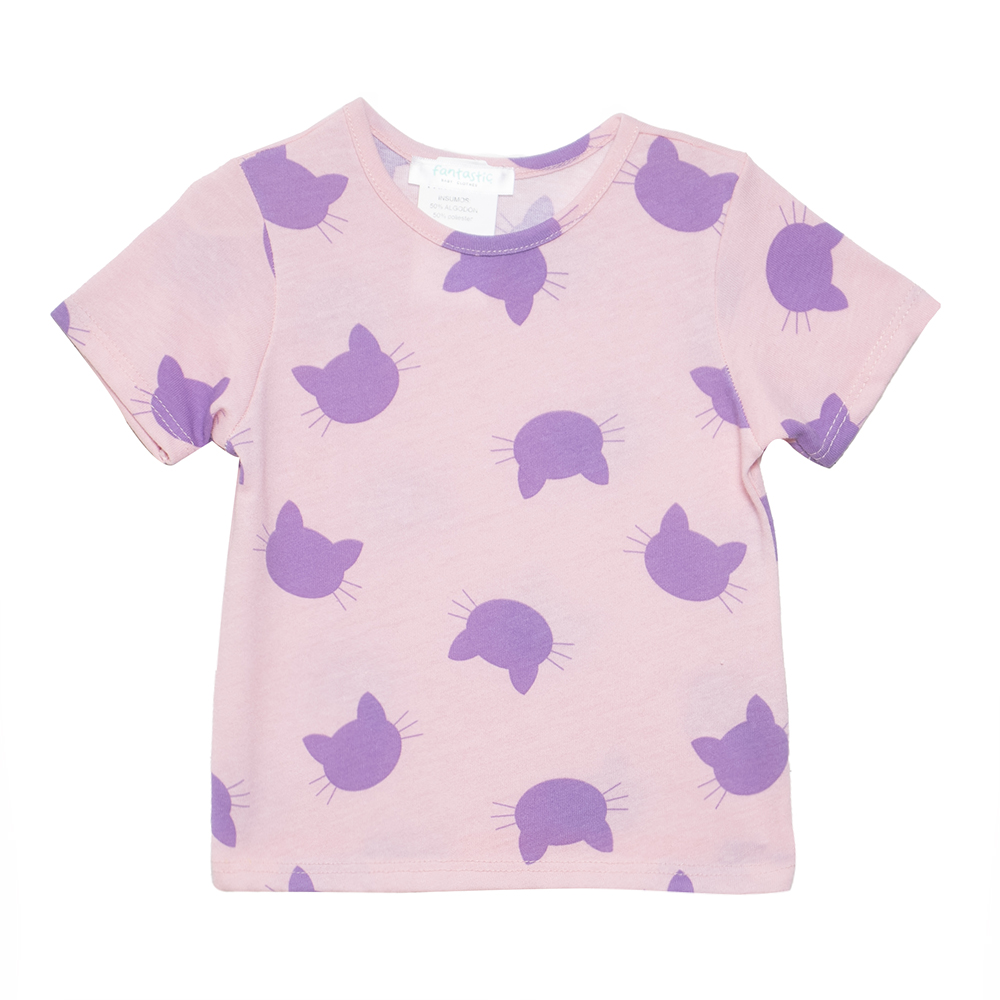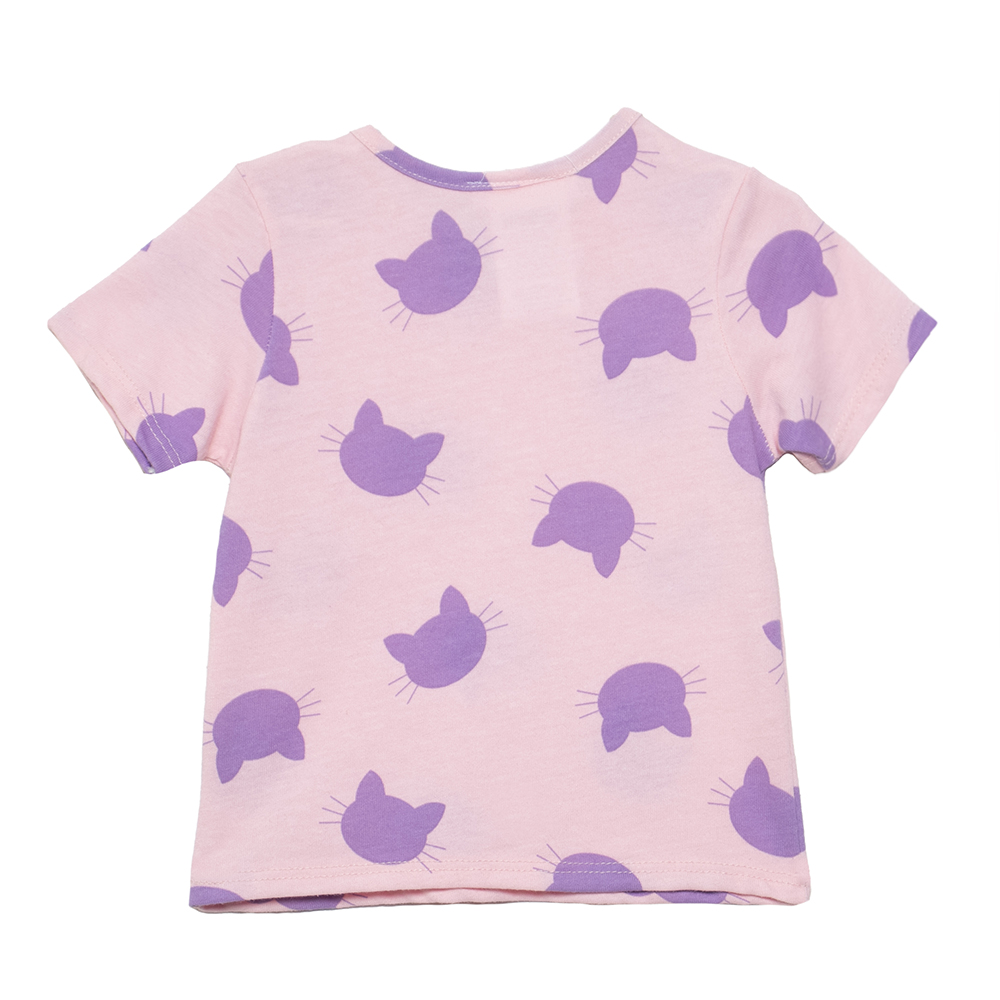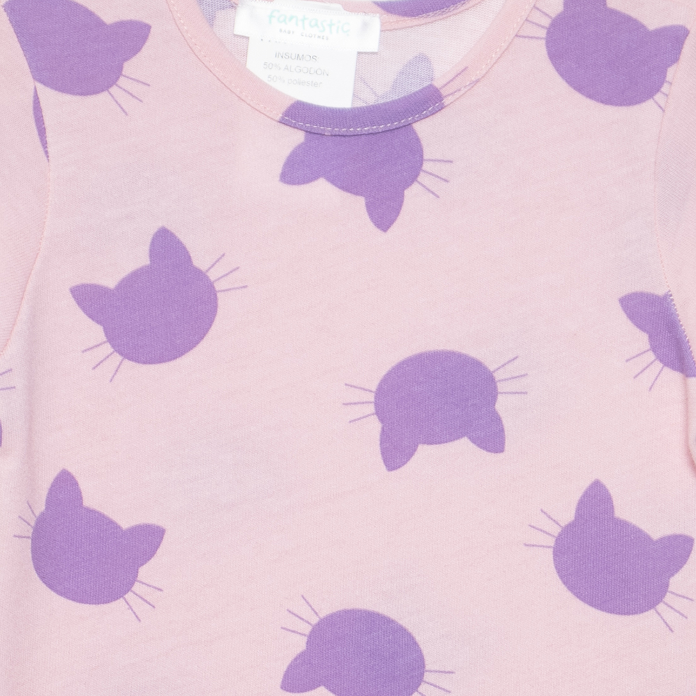 Playera para bebé con encantador estampado completo de gatos, cuello redondo y mangas cortas. Su diseño divertido y colorido es perfecto para cualquier día.