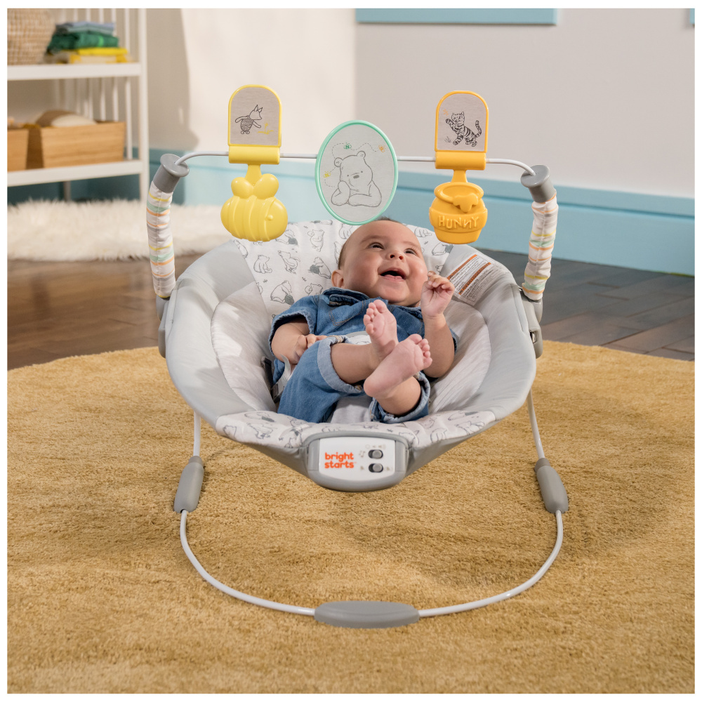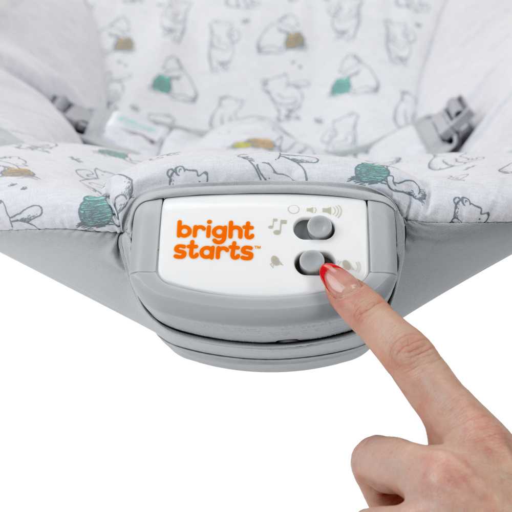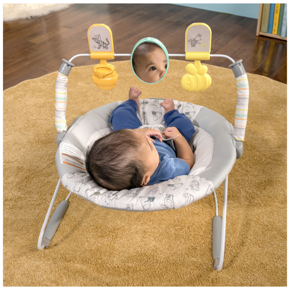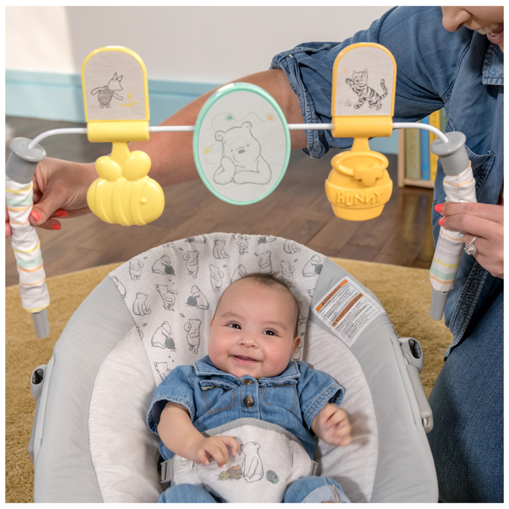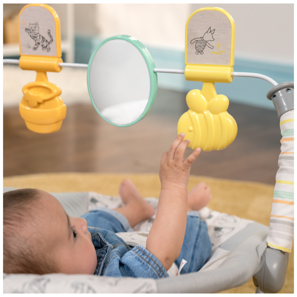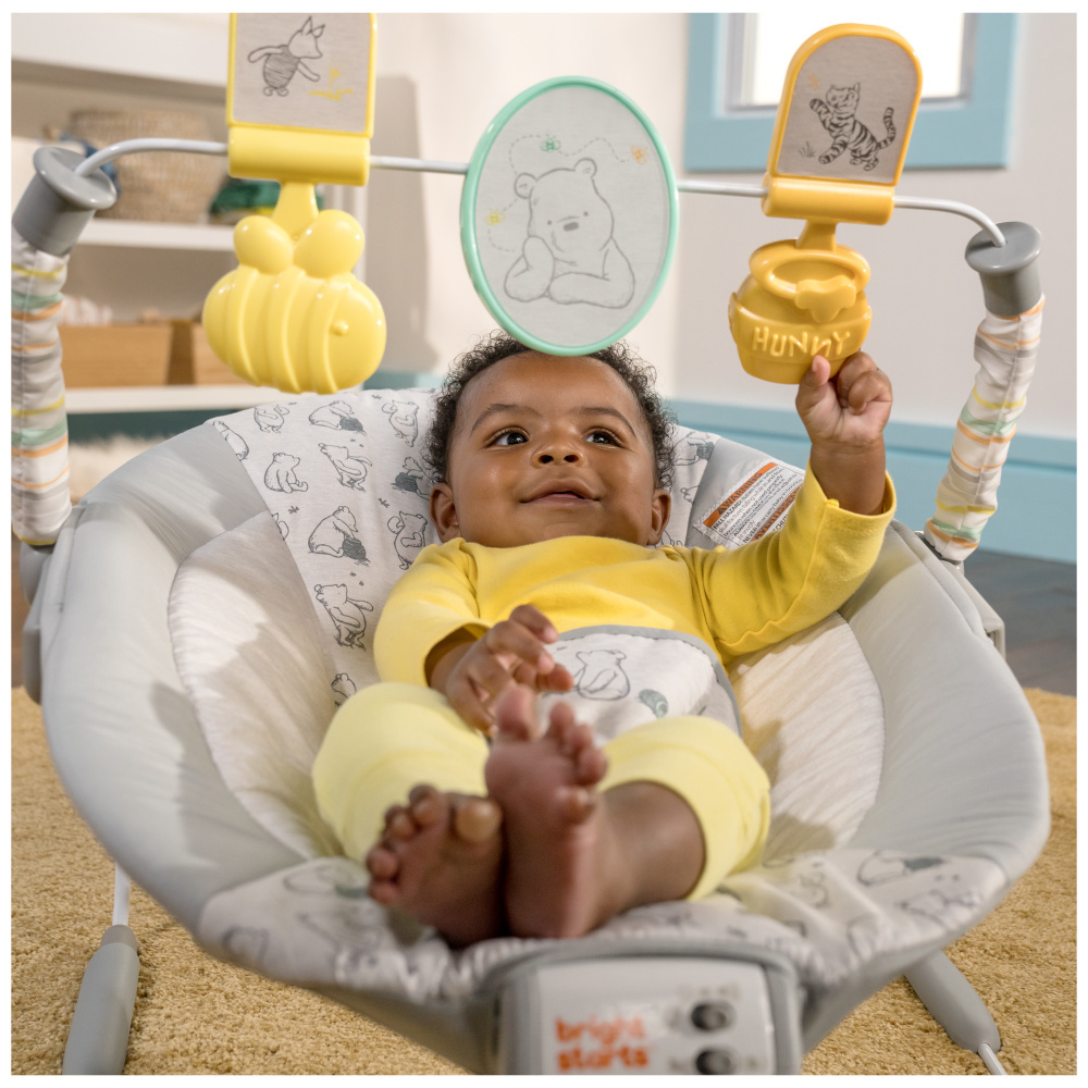 Dale a tu bebé el cuidado ideal que necesita con el asiento mecedor de Disney y llena a tu pequeño de horas de diversión con el diseño del emblemático personaje Winnie Pooh. El lindo y suave peluche del icónico oso amarillo y la sonaja con forma del tierno Tigger lo acompañarán en su día a día para que se sienta acompañado siempre.