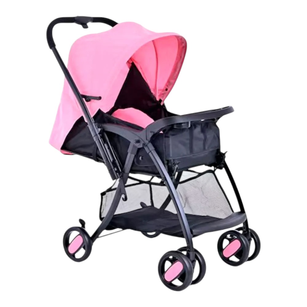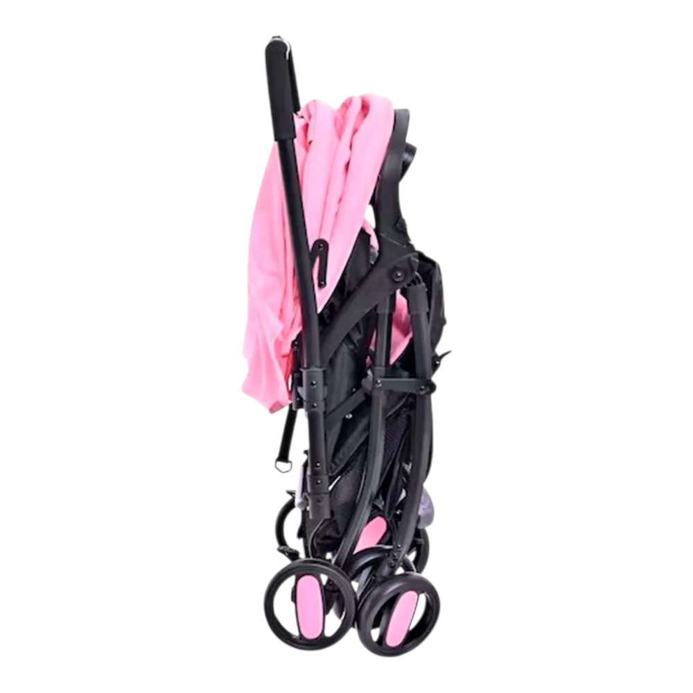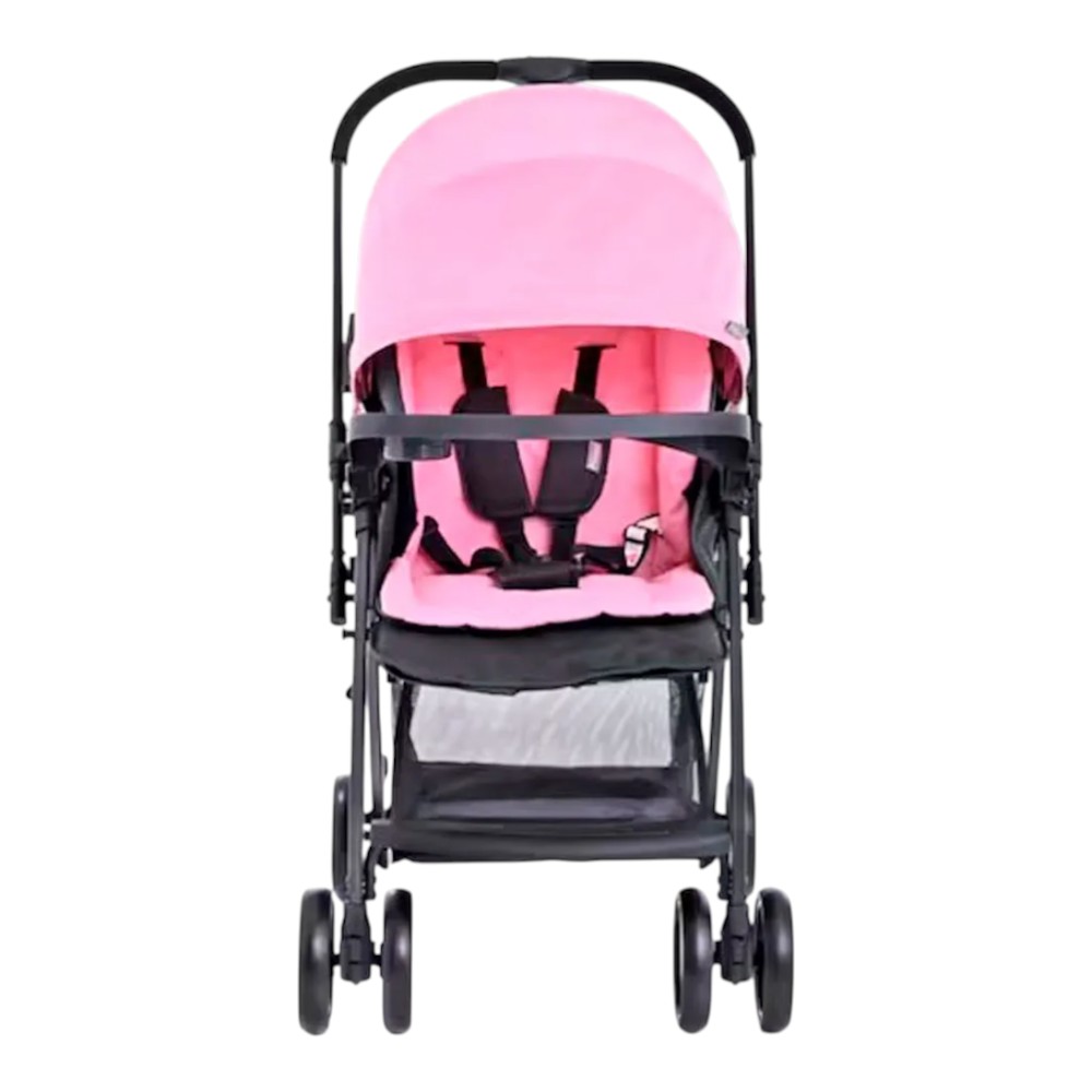 Diseño en color rosa con arnés de seguridad y frenos en las llantas.