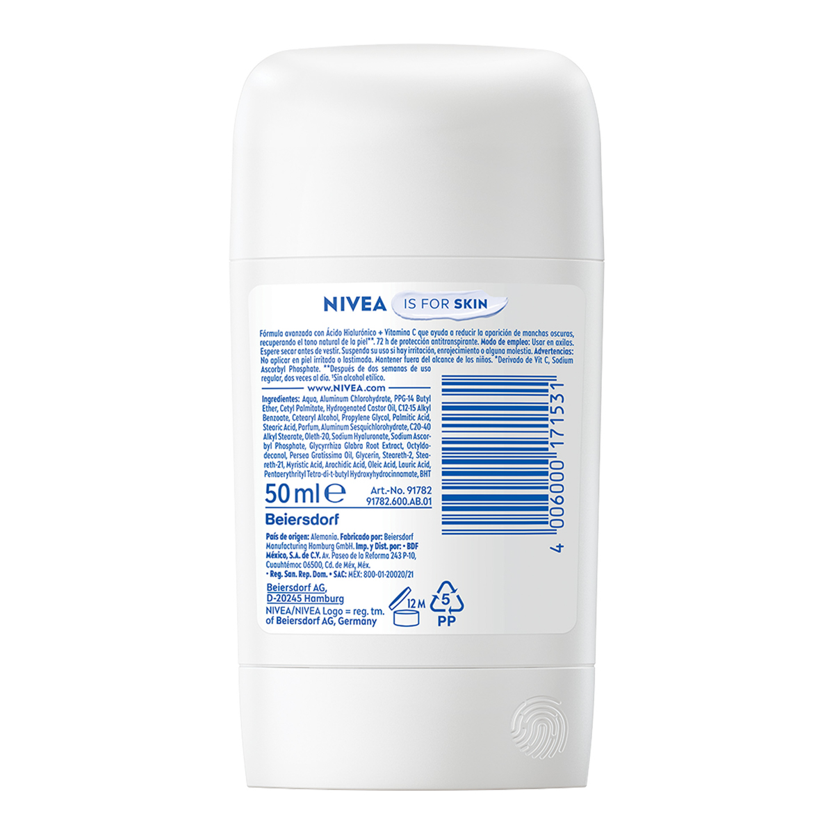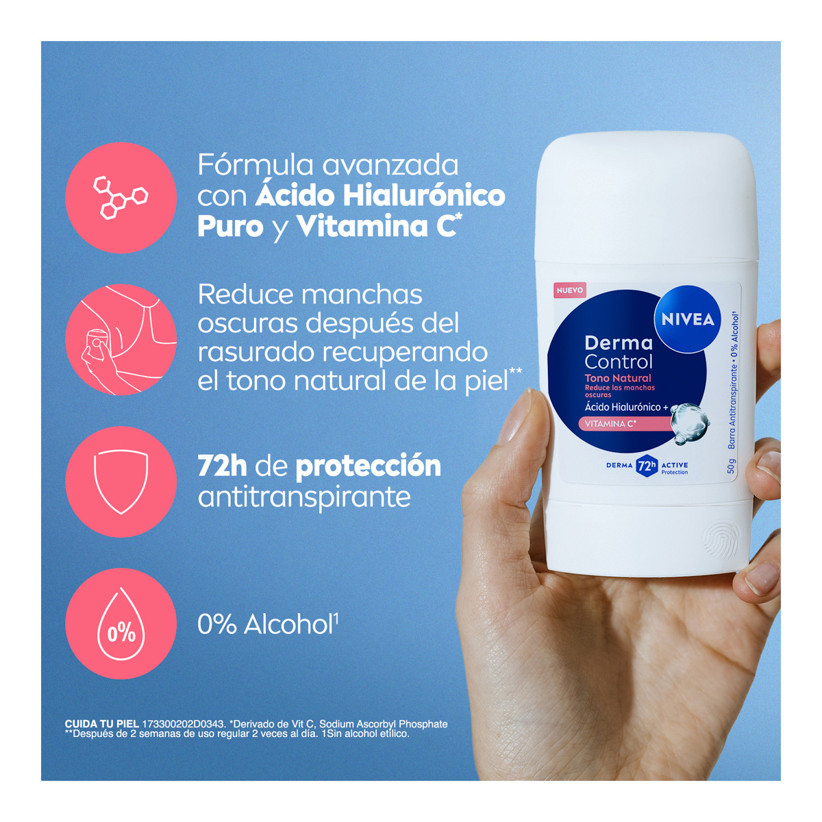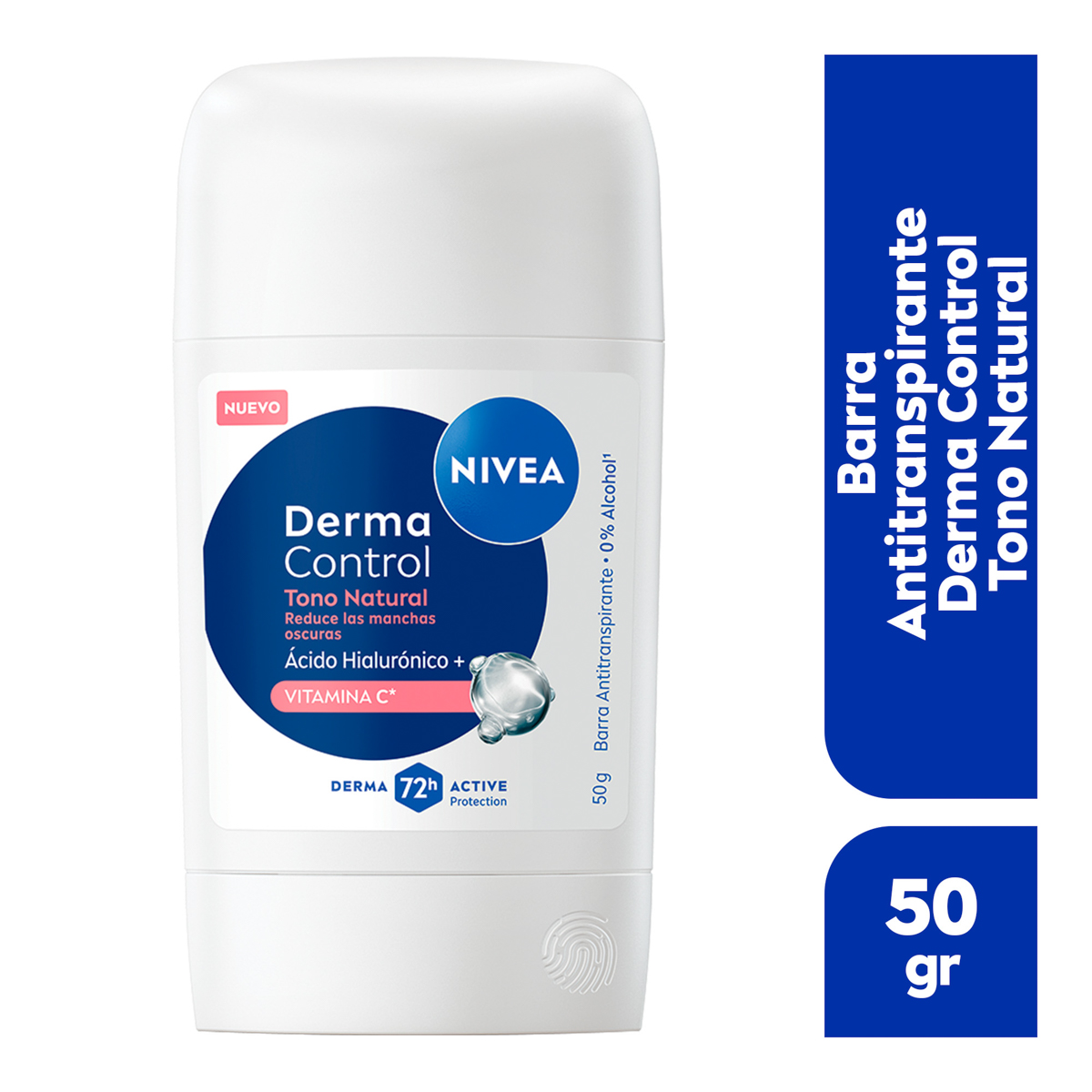 Recupera el tono natural de tu piel con Nivea Derma Control. Luce unas axilas impecables con este antitranspirante en barra, no solo te ofrece una protección extrema contra el sudor, sino que actúa activamente para reducir las manchas oscuras y unificar el tono de tu piel. Gracias a su exclusiva fórmula potenciada con ácido hialurónico y vitamina C, este desodorante proporciona un cuidado dermatológico profundo que hidrata y renueva la apariencia de la piel con cada aplicación. Disfruta de una sensación de frescura y seguridad por hasta 72 horas.