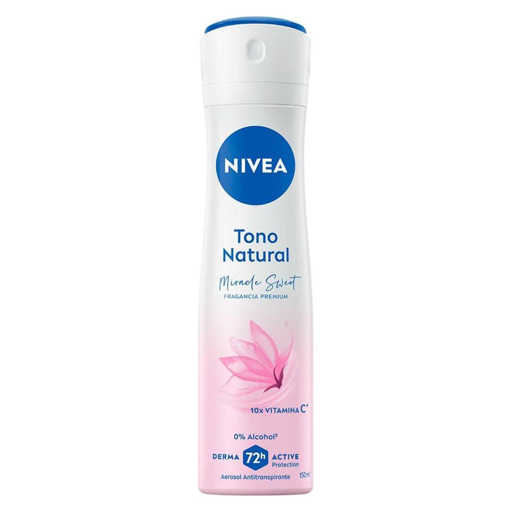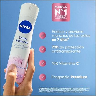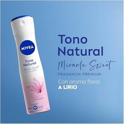 Brinda a tu piel un cuidado y frescura duraderas con el antitranspirante en aerosol Nivea Tono Natural Miracle Sweet, ofrece una fragancia de primera calidad y beneficios avanzados para el cuidado de la piel. Enriquecido con vitamina C y libre de alcohol, es suave y no irrita, dejando las axilas más brillantes y suaves.