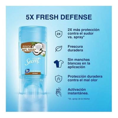 Escápate a una isla de frescura con la protección invisible que evita el sudor y las manchas blancas. Déjate llevar por el suave y tropical aroma a coco del desodorante antitranspirante en gel Secret. Su fórmula de aplicación transparente te brinda una protección confiable y de larga duración contra la humedad y los olores, sin dejar residuos. Disfruta de la sensación fresca y limpia que te acompaña todo el día, con la garantía de un producto libre de crueldad animal.