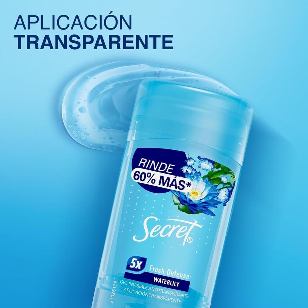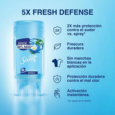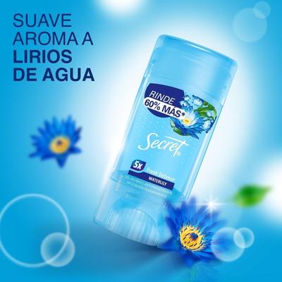 La esencia pura de los lirios se une a una protección 5 veces más poderosa. Frescura intensa que cuida tu piel sin dejar rastro. El gel antitranspirante Secret Waterlily combina un aroma floral y delicado con la eficacia de la Tecnología 5X Fresh Defense. Su fórmula de aplicación transparente ofrece una protección superior contra el sudor y el mal olor, secándose al instante para una sensación de limpieza y frescura que te acompaña todo el día, sin dejar residuos blancos.