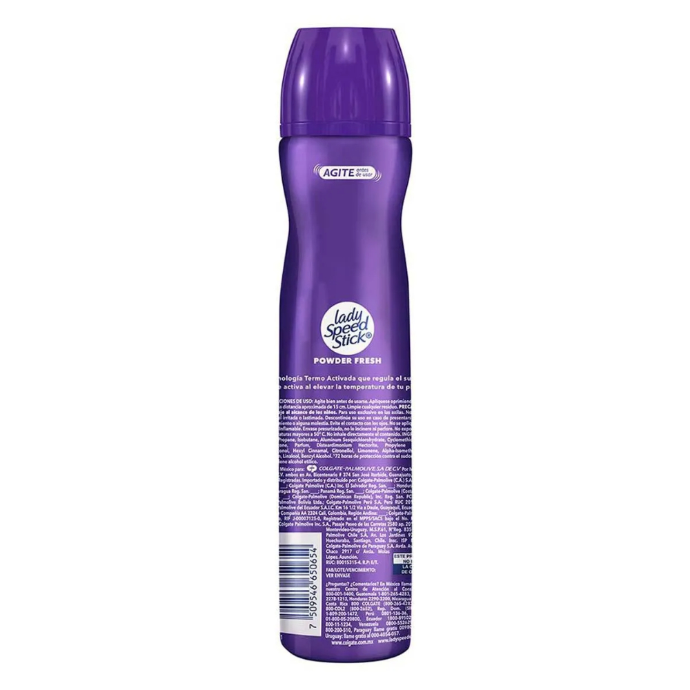 Frescura invencible que dura todo el día. El antitranspirante Lady Speed Stick Powder Fresh es el aliado perfecto para las mujeres que no se detienen. Su avanzada tecnología Termo-Activada detecta el calor corporal para brindarte una ráfaga de protección justo cuando más lo necesitas. Con un suave y delicado aroma, este aerosol te mantiene seca, cómoda y segura, ofreciendo una experiencia de frescura superior que te acompaña desde la mañana hasta la noche, sin importar la intensidad de tus actividades.