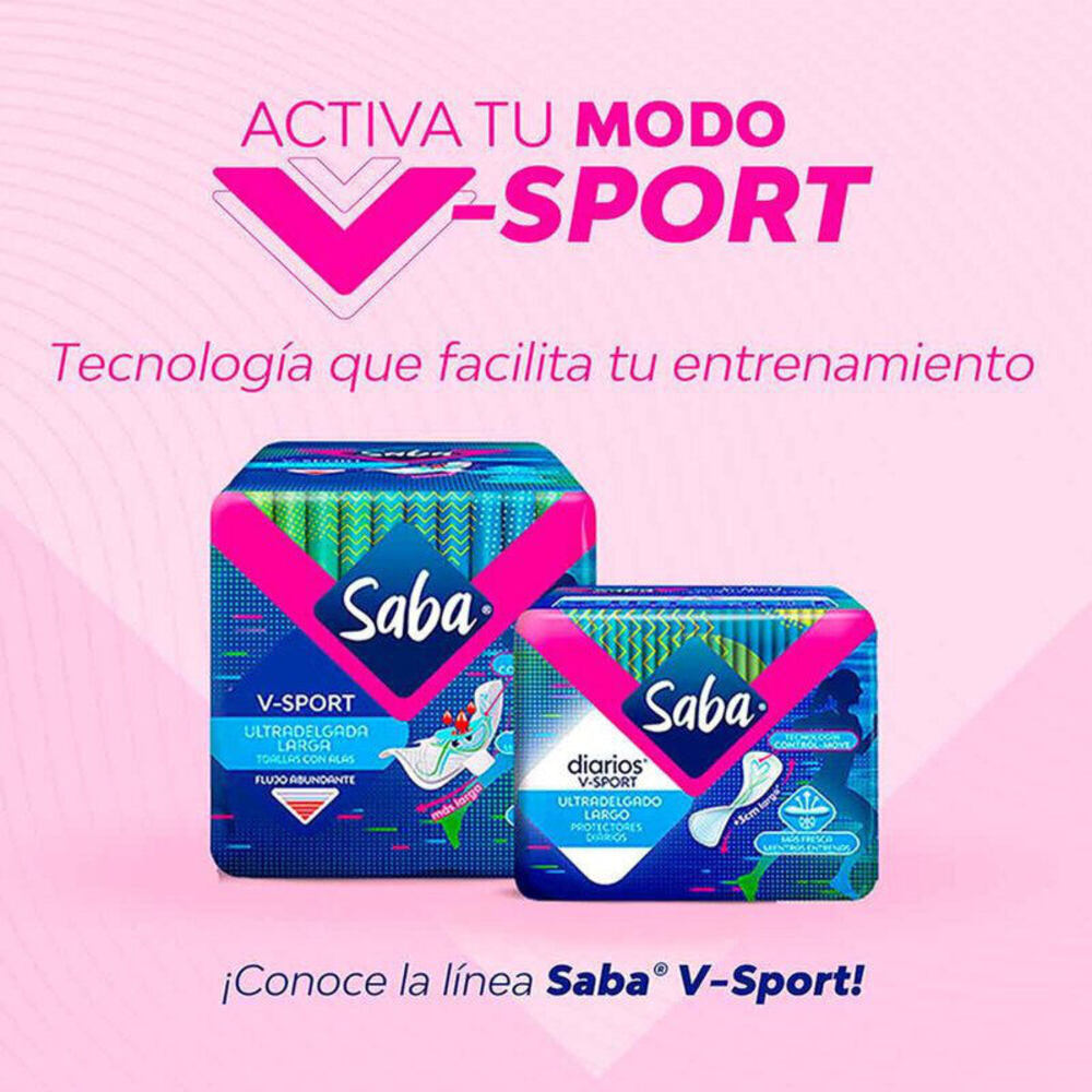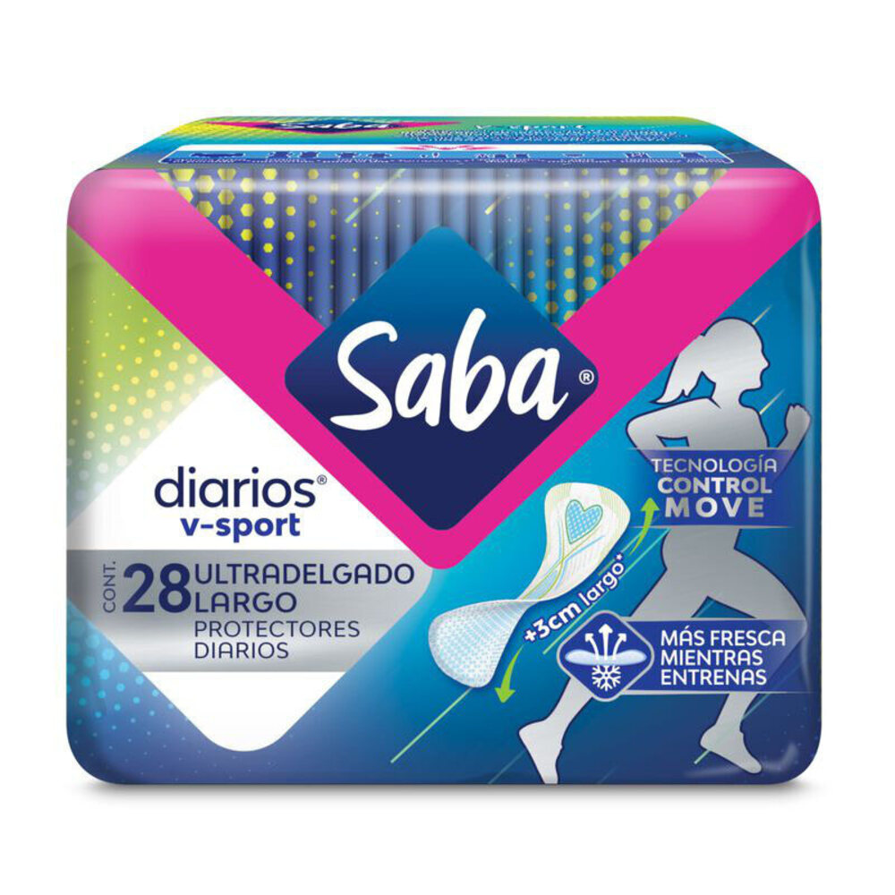 Escoge sentirte segura y protegida con los protectores diarios v- sport ultradelgado largo de Saba, te cuidan durante tu periodo. Con su tecnología te permite tener un ajuste perfecto y respirable para sentirte fresca mientras entrenas. Mantente segura y siéntete aún más cómoda.