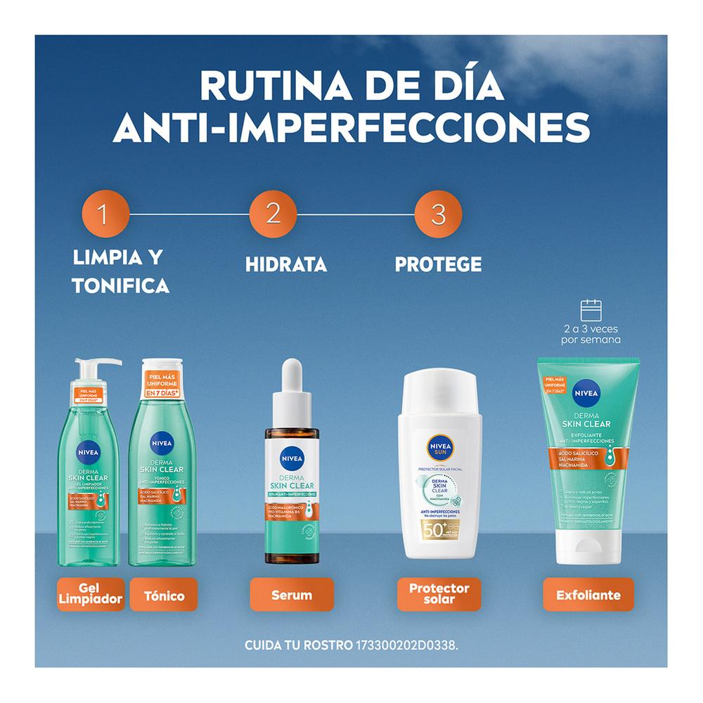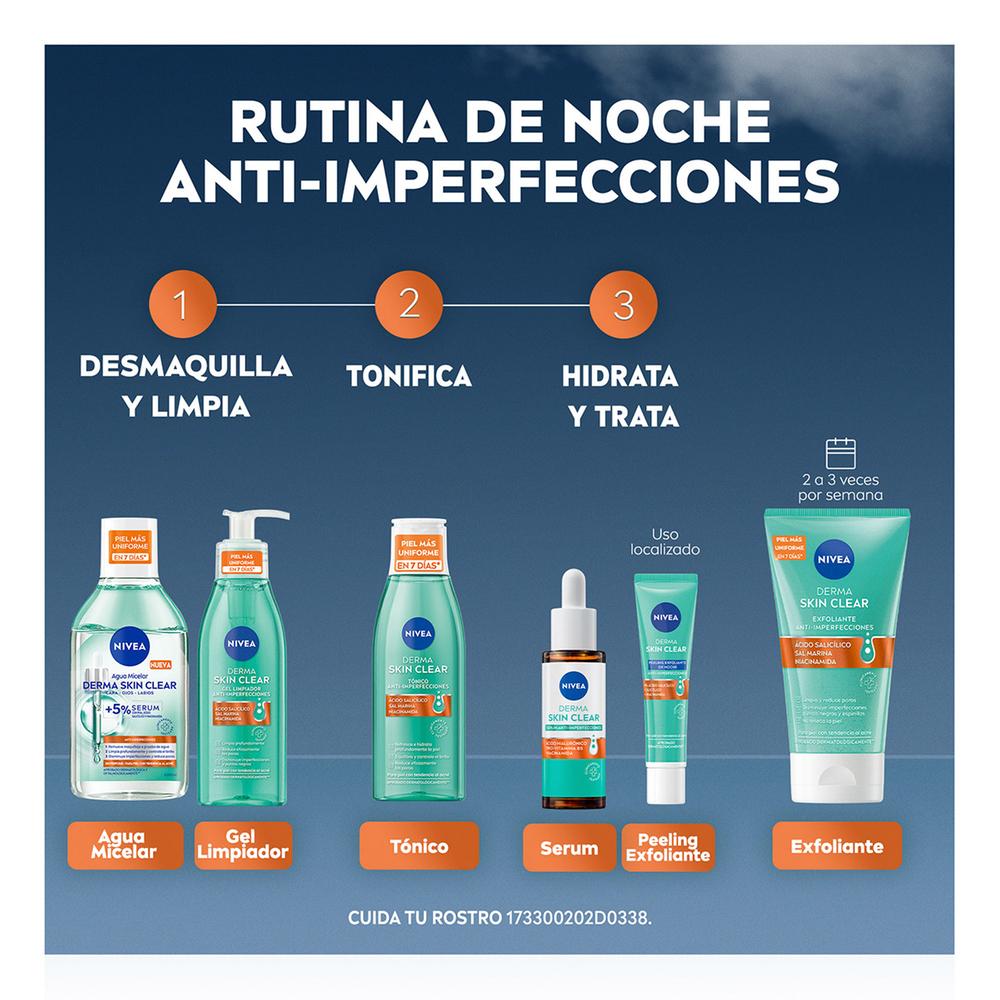 Limpia profundamente la piel de tu rostro con el agua micelar Nivea Derma Skin Clear Anti-Imperfecciones, remueve el maquillaje a prueba de agua de tu cara, ojos y labios, además de impurezas y exceso de grasa sin necesidad de frotar. Su textura ligera y refrescante con ácido salicílico y niacinamida ayuda a reducir imperfecciones, controlar el brillo y minimizar la apariencia de los poros, dejando la piel limpia, fresca y sin sensación grasosa.