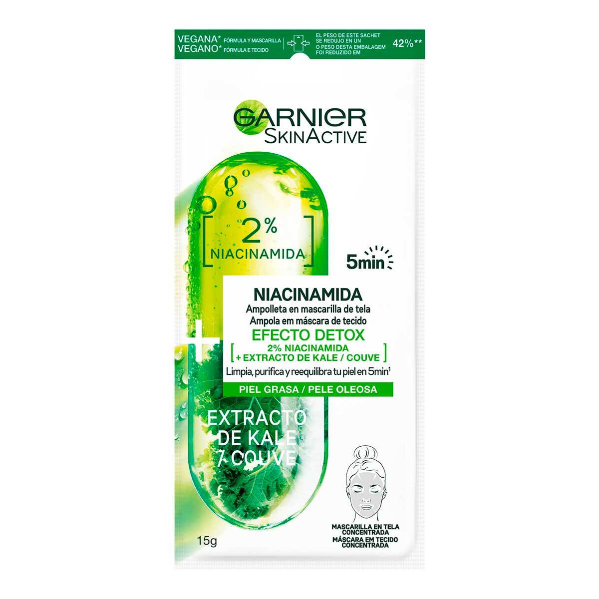 Limpia, purifica y reequilibra tu piel con la mascarilla en tela de Garnier Skin Active con extracto de Kale. Ayuda a desintoxicar disminuyendo el exceso de sebo en solo 5 minutos y obtén una piel nutrida. Revitaliza las zonas secas y grasas, dándoles la desintoxicación que necesitan, además está adicionada con 2% niacinamida que ayuda visiblemente a reducir las imperfecciones. Con ingredientes activos dermales e ingredientes naturales como el kale, que está repleto de nutrientes, vitaminas y antioxidantes.