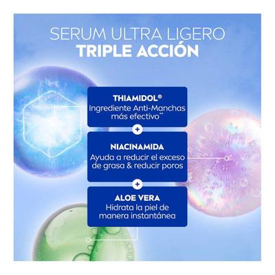 Atributos: Piel luminosa Disminuye la apariencia de los poros y suaviza la piel Hidratación profunda y sensación de frescura al instante Dermatológicamente comprobado Unifica el tono de la piel en 3 días Ayuda a reducir manchas en 2 semanas Ideal para agregarlo a tu rutina de skincare