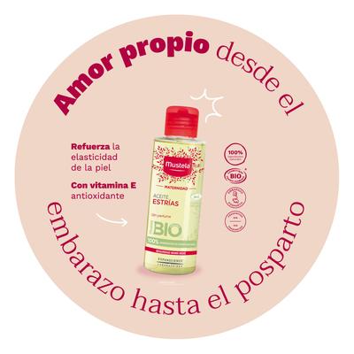 El aceite para estrías Mustela maternidad está especialmente formulado para ayudar a prevenir y reducir la aparición de estrías durante el embarazo y el postparto. Su fórmula rica en ingredientes naturales nutre profundamente la piel, mejora su elasticidad y la mantiene suave y flexible. De rápida absorción, se aplica fácilmente en abdomen, caderas, muslos y senos, proporcionando un cuidado diario seguro y eficaz que respeta la delicada piel de las futuras y nuevas mamás.