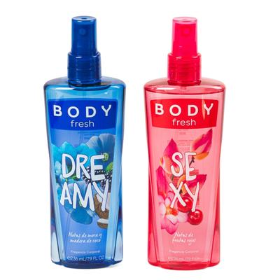 Llena tu piel de un aroma exquisito con las fragancias corporales de Body Fresh, Este set incluye 2 fragancias con notas de mora y madera de coco y notas de frutos rojos que te acompañarán en tu día a día para que siempre tengas un aroma delicioso. Dale un toque especial a tu vida y prueba estas fragancias corporales.