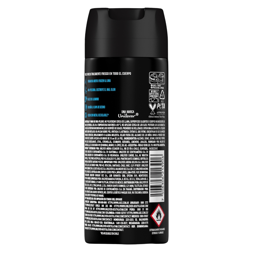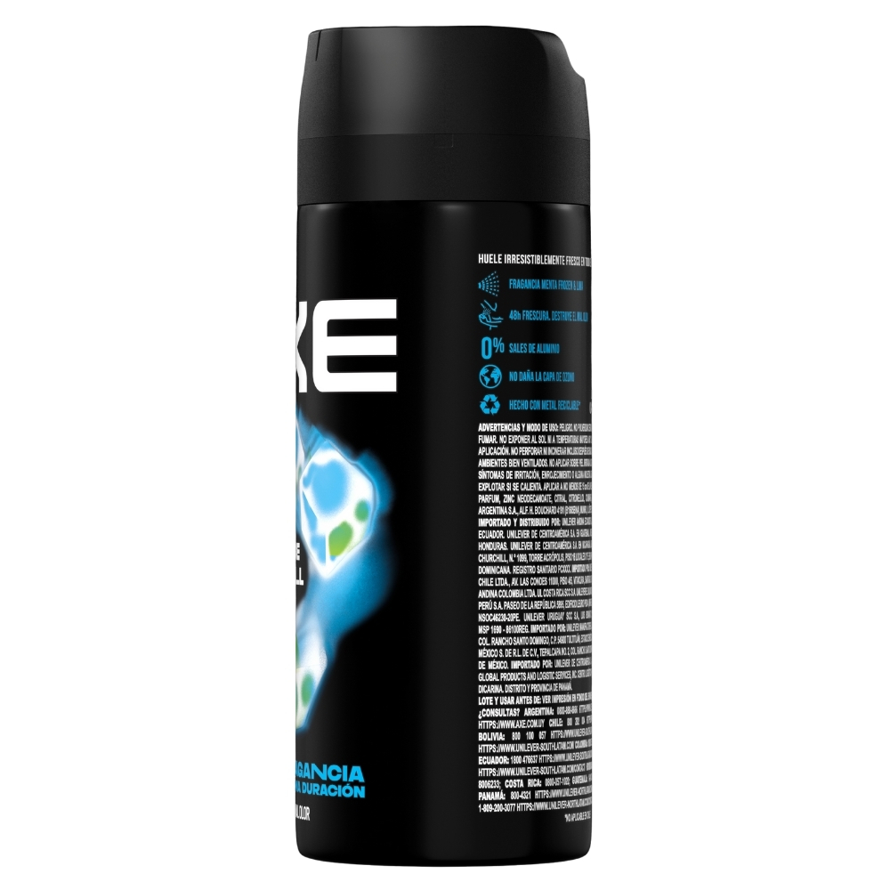 Disfruta del desodorante en aerosol Axe Ice Chill que te brinda una máxima duración con cada aplicación. Su fragancia de alta definición y frescura crea un irresistible e intenso aroma con toques de menta frozen y lima que se mantendrán todo el día. Experimenta una mayor seguridad con cada movimiento mientras bloqueas los efectos de la transpiración. Destruye el mal olor y protege tus axilas por mucho más tiempo.