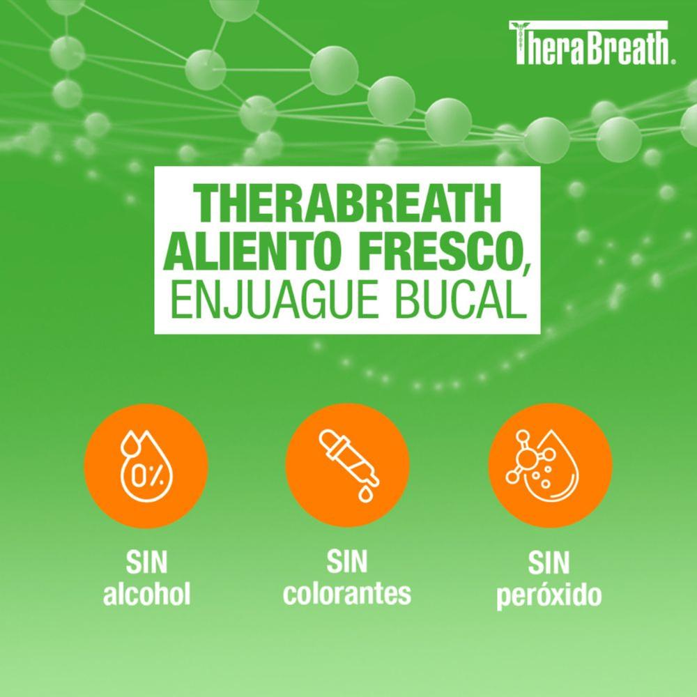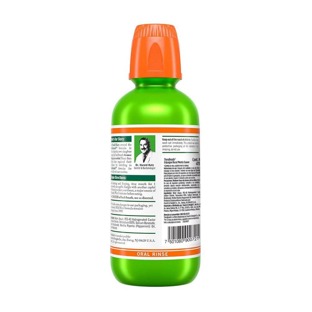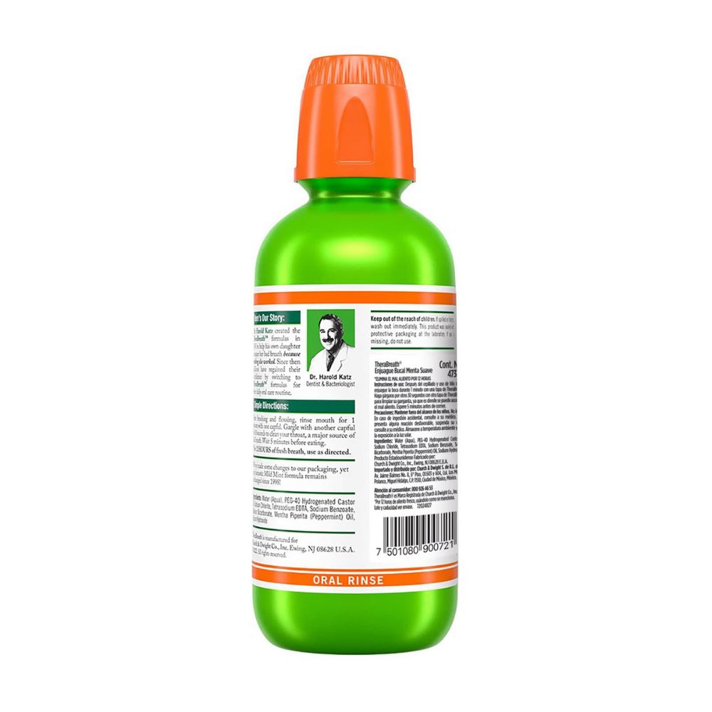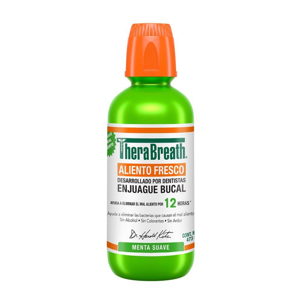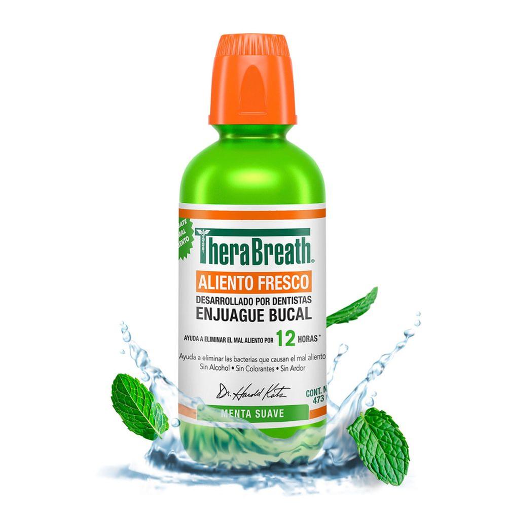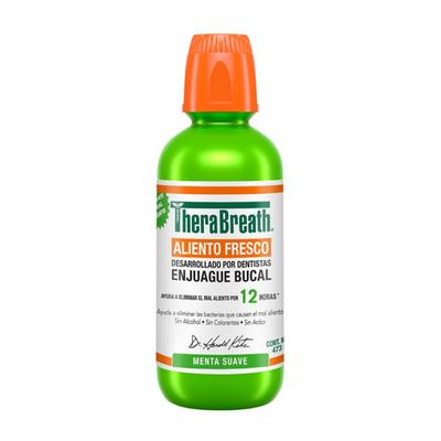Protege tu boca contra el mal aliento hasta por 12 horas con TheraBreath Menta Suave, el enjuague bucal sin alcohol y sin ardor que ayuda a eliminar las bacterias que causan el mal aliento. Su fórmula desarrollada por dentistas no contiene sabores ni colorantes artificiales, es vegana, sin gluten y cumple con estándares Kosher.