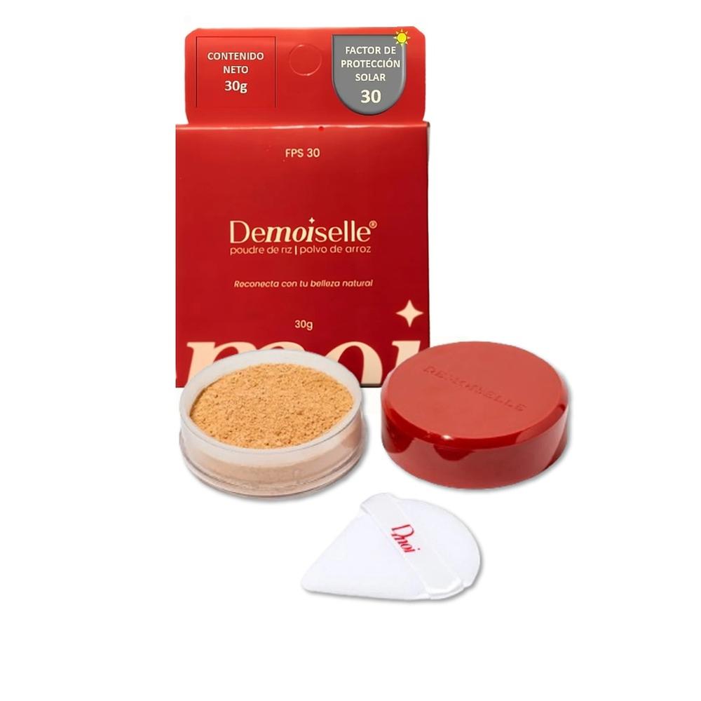Dale a tu piel el cuidado que merece con el polvo de arroz de Demoiselle. Gracias a su fórmula de textura ligera y suavidad al tacto, es el aliado perfecto para quienes buscan un rostro impecable y libre de brillo durante horas. Su fórmula con ingredientes minerales de cualidades astringentes, antisépticas y de protección solarse, se adapta suavemente a tu cutis, difuminando imperfecciones y dejando un acabado natural. Adicionado con FPS 30, te brinda una capa adicional de defensa contra los rayos UV mientras luces un maquillaje perfecto. Su textura fina permite una aplicación uniforme y cómoda durante todo el día.