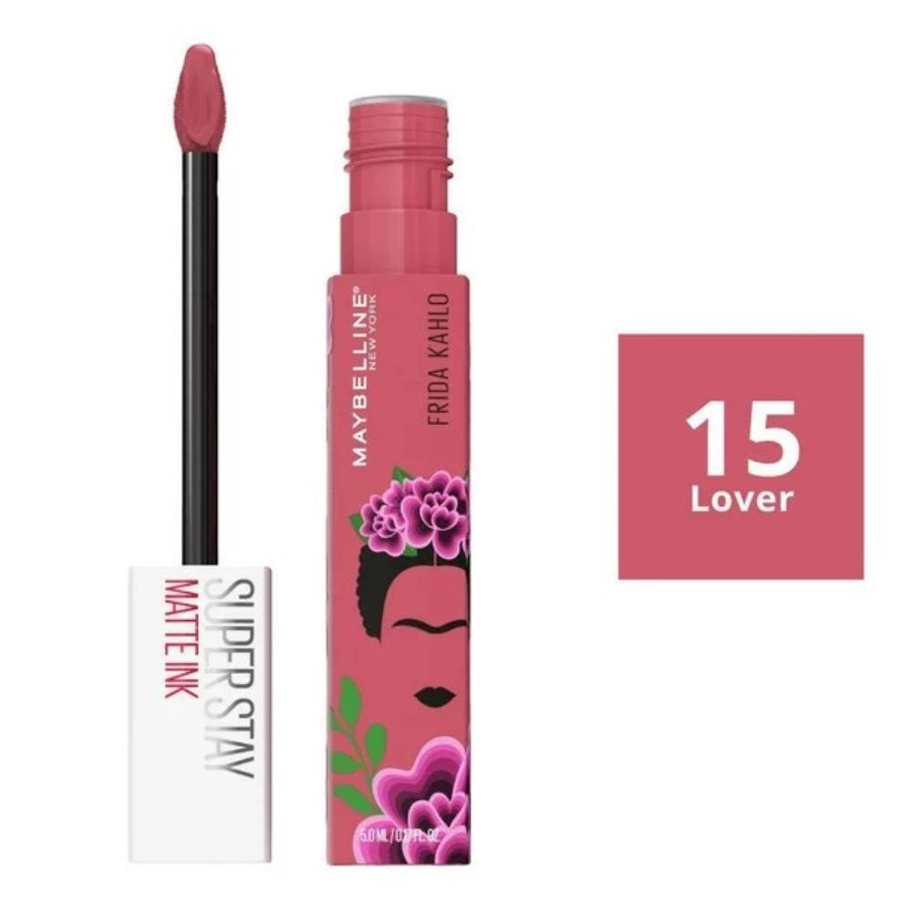 Descubre el Labial Líquido SuperStay Matte Ink de la marca Maybelline que dejará un efecto mate de extrema pigmentación y larga duración. Gracias a su tono Lover podrás tener un acabado intenso durante todo el día. No reseca tus labios y te brinda una textura aterciopelada, además recibirás una humectación profunda en cada aplicación. Su empaque de la edición especial de Frida Kahlo tiene un diseño original que te encantará.