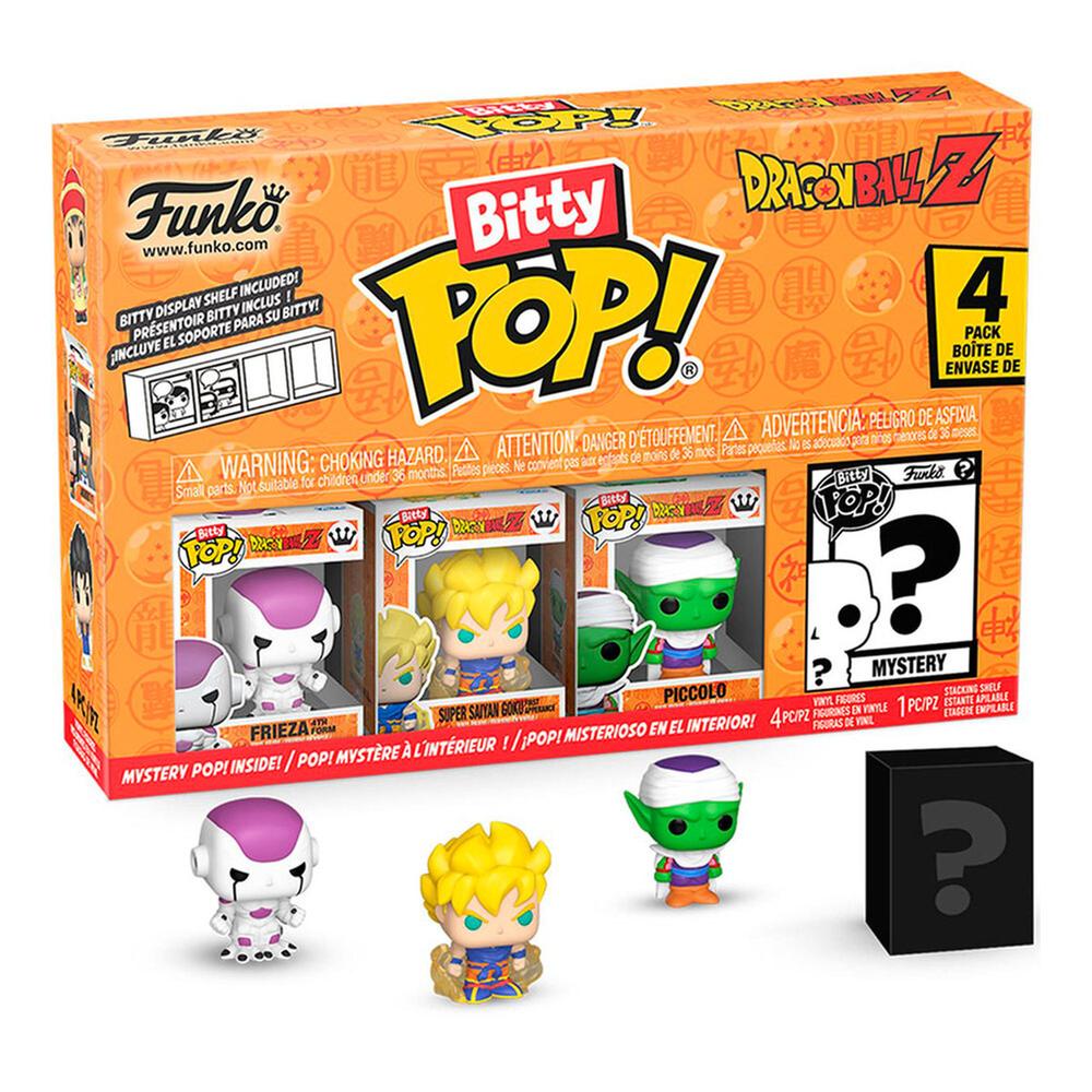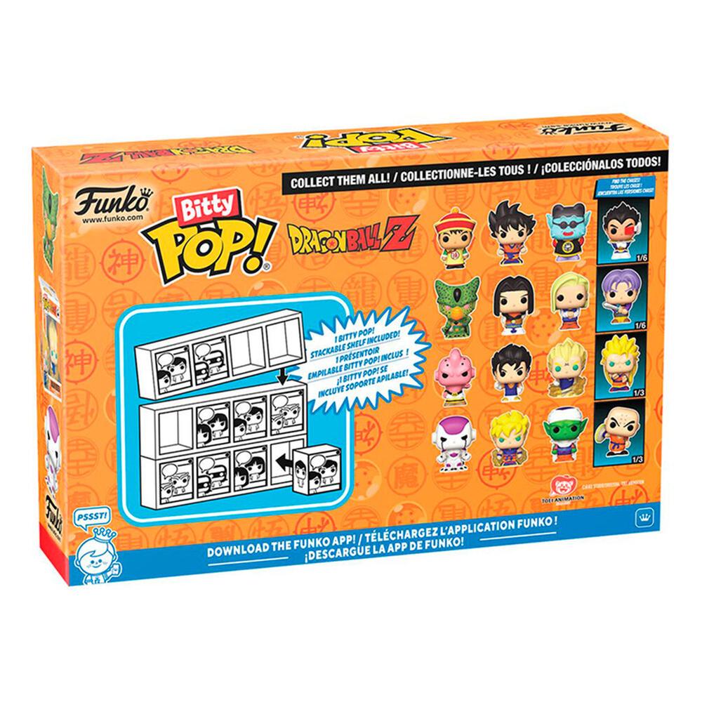 Tus Funko favoritos de la exitosa serie de anime Dragon Ball Z se han encogido en coleccionables Bitty Pop! Vive una fantástica aventura con los personajes más queridos y descubre nuevas sorpresas. Este paquete incluye cuatro piezas y vienen en estuches de acrílico duro con desmontables tapas inferiores, que también funcionan como bases a las que se adhieren las figuras.