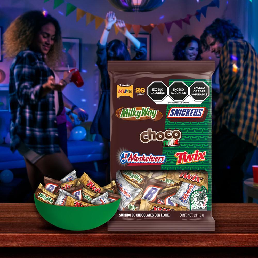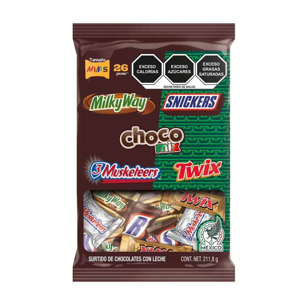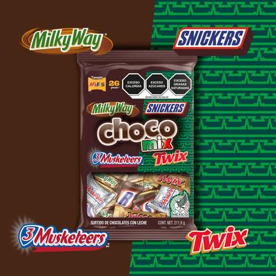 Vive la emoción del mundial a lo grande con el surtido de chocolates con leche Choco Mix, que viene con una gran variedades de chocolates como lo son Milky Way, Snickers, 3 Musketeers y Twix y disfruta de está edición especial que cuenta con una colaboración con la selección mexicana, su increíble empaque edición limitada tiene un increíble diseño que hace alución a la camiseta del TRI para entregarte algo único.