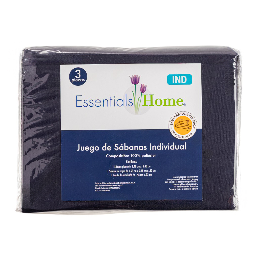 Descubre el lujo del descanso con el juego de sábanas Essentials Home para colchón alto. Está elaborado con tejidos de poliéster de primera calidad. Incluye una sábana plana, sábana de cajón y funda de almohada que te proporcionan confort y elegancia en cada detalle. Este modelo individual en color azul marino es la elección perfecta para transformar tu dormitorio en un espacio de tranquilidad.