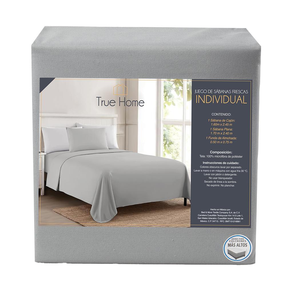 Descubre el lujo del descanso con el juego de sábanas frescas True Home. Elaborado con 100% microfibra de poliéster, está diseñado para colchones de perfiles altos. Incluye una sábana de cajón, sábana plana y funda de almohada que te ofrecen confort y elegancia en cada detalle. Este modelo individual en color gris claro es la elección perfecta para transformar tu dormitorio en un espacio acogedor y de tranquilidad.