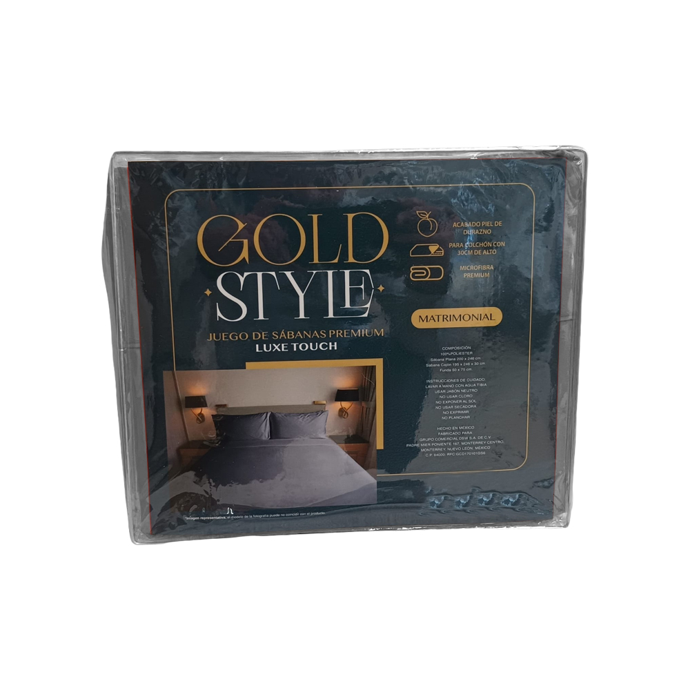 Eleva el confort y estilo en tu habitación con el juego de sábanas premium Luxe Touch de Gold Style. Confeccionadas con microfibra 100% poliéster y acabado tipo piel de durazno, este modelo en tamaño matrimonial es idóneo para colchones de hasta 30 cm de alto. Trae una sábana plana, sábana de cajón y funda para almohada en color gris que añadirán un toque de elegancia y comodidad a tu descanso diario.