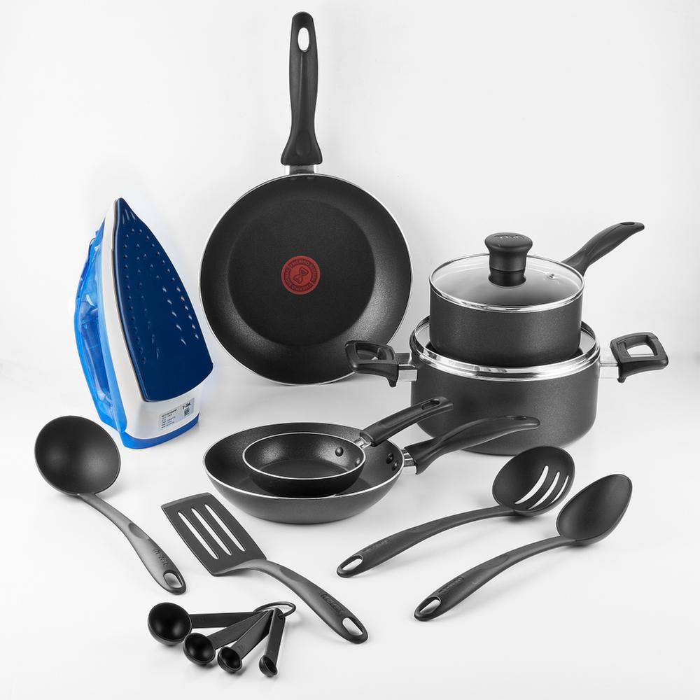 Cocina todos los días con la batería T-Fal. Sus piezas están fabricadas con cuerpos de aluminio en color negro. Tienen un revestimiento interior antiadherente de alta calidad, al que ningún alimento se le pega. Viene con utensilios de nailon aptos para altas temperaturas, cucharas medidoras, ¡además de una plancha con suela de excelente deslizamiento y potente vapor!