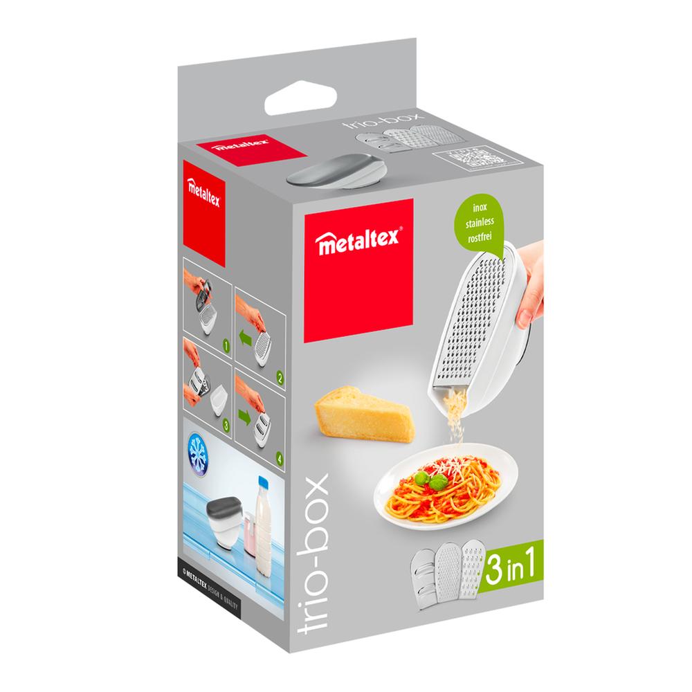 Transforma tu experiencia en la cocina con el rallador Trio-Box de Metaltex. Este modelo 3 en 1 te ofrece un utensilio con intercambiables láminas de acero inoxidable que permiten obtener una ralladura fina, mediana y corte en rodajas con facilidad. Además, ahorra tiempo y esfuerzo en cada preparación, gracias a su innovador contenedor de plástico con tapa.