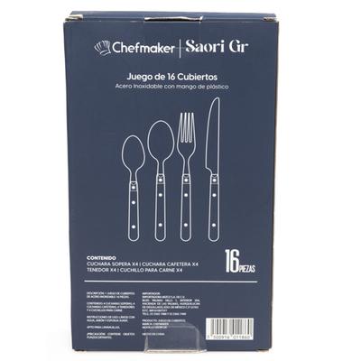 Organiza una cena formal o simplemente disfruta una comida familiar con el juego de cubiertos Saori de Chefmaker. Está fabricado con cuerpos de acero inoxidable y mangos de plástico. Contiene 16 piezas para un servicio de cuatro personas. Es una imprescindible adición para tu mesa, ya que combina durabilidad y versatilidad. Además, destaca por su calidad y ergonómico diseño en color verde.