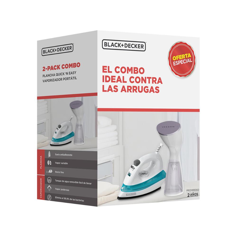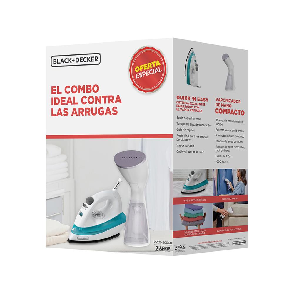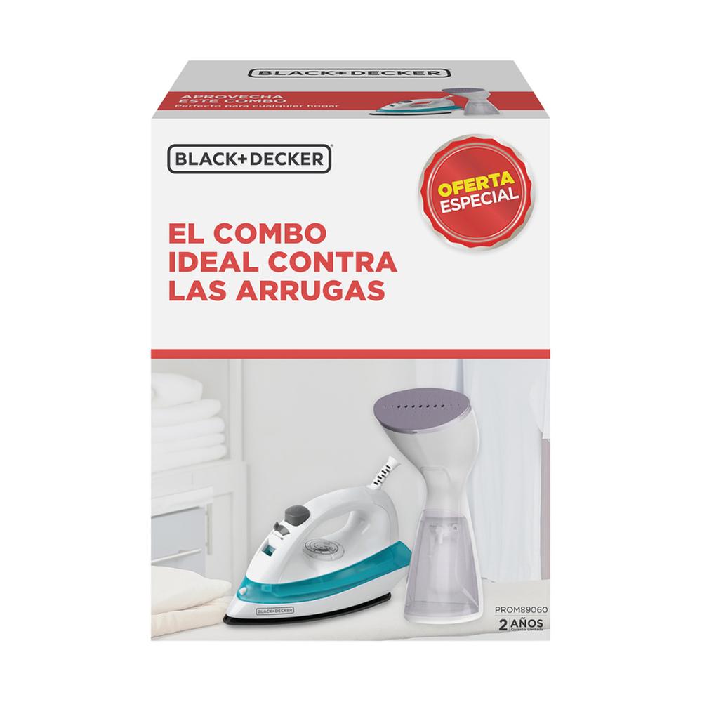 El combo Black & Decker PROM89060 incluye una plancha y un vaporizador, ideales para el cuidado completo de la ropa. Ofrece practicidad y eficiencia para eliminar arrugas de forma rápida, siendo una excelente opción para el hogar.
