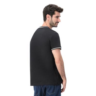 Playera negra con detalles blancos en cuello y mangas que destaca por su diseño moderno. Confeccionada con tejido suave que ofrece confort y un ajuste cómodo para cualquier ocasión casual.