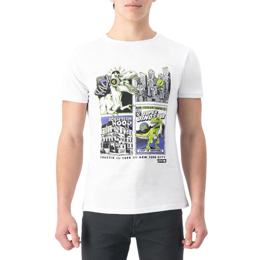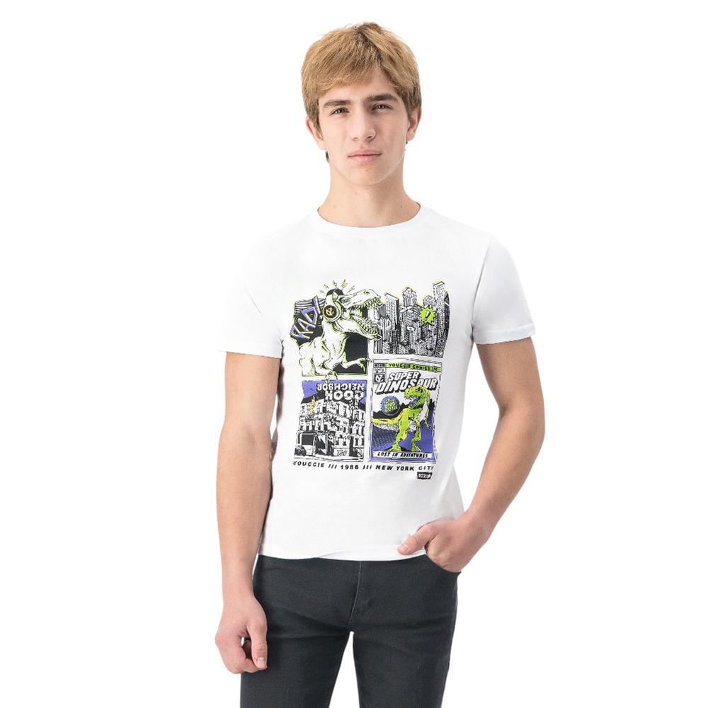 Eleva tu estilo casual con esta playera de cuello redondo. Su diseño de manga corta y estampado frontal en el pecho le dan un toque moderno y distintivo. Una prenda cómoda y versátil, ideal para cualquier ocasión.