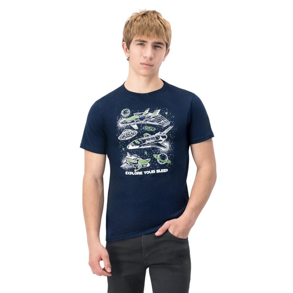 Eleva tu estilo casual con esta playera de cuello redondo. Su diseño de manga corta y estampado frontal en el pecho le dan un toque moderno y distintivo. Una prenda cómoda y versátil, ideal para cualquier ocasión.