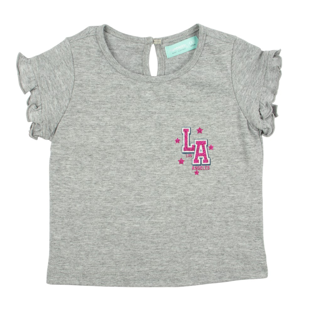 Playera con cuello redondo, botón en parte posterior, estampado en pecho y manga corta con olán