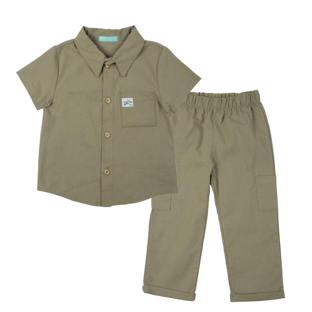 Este conjunto para bebé combina estilo y comodidad con una camisa de diseño liso, mangas cortas y cierre de botones delanteros que facilita el vestir. La bolsa en el pecho añade un detalle encantador, mientras que el pantalón con cintura elástica ofrece un ajuste cómodo y práctico. Sus bolsas tipo cargo en la pierna aportan un toque moderno y funcional para cualquier ocasión.