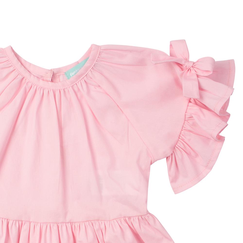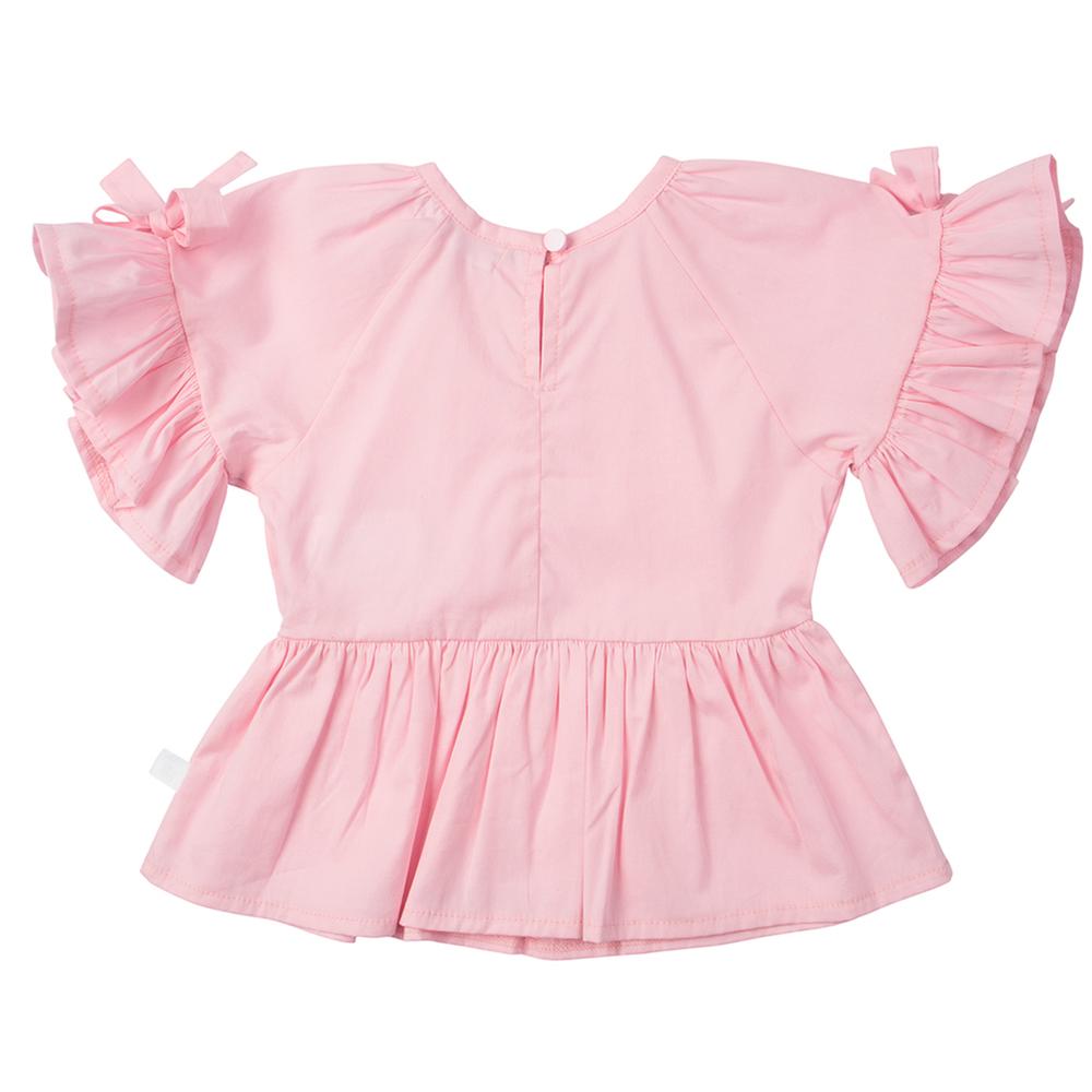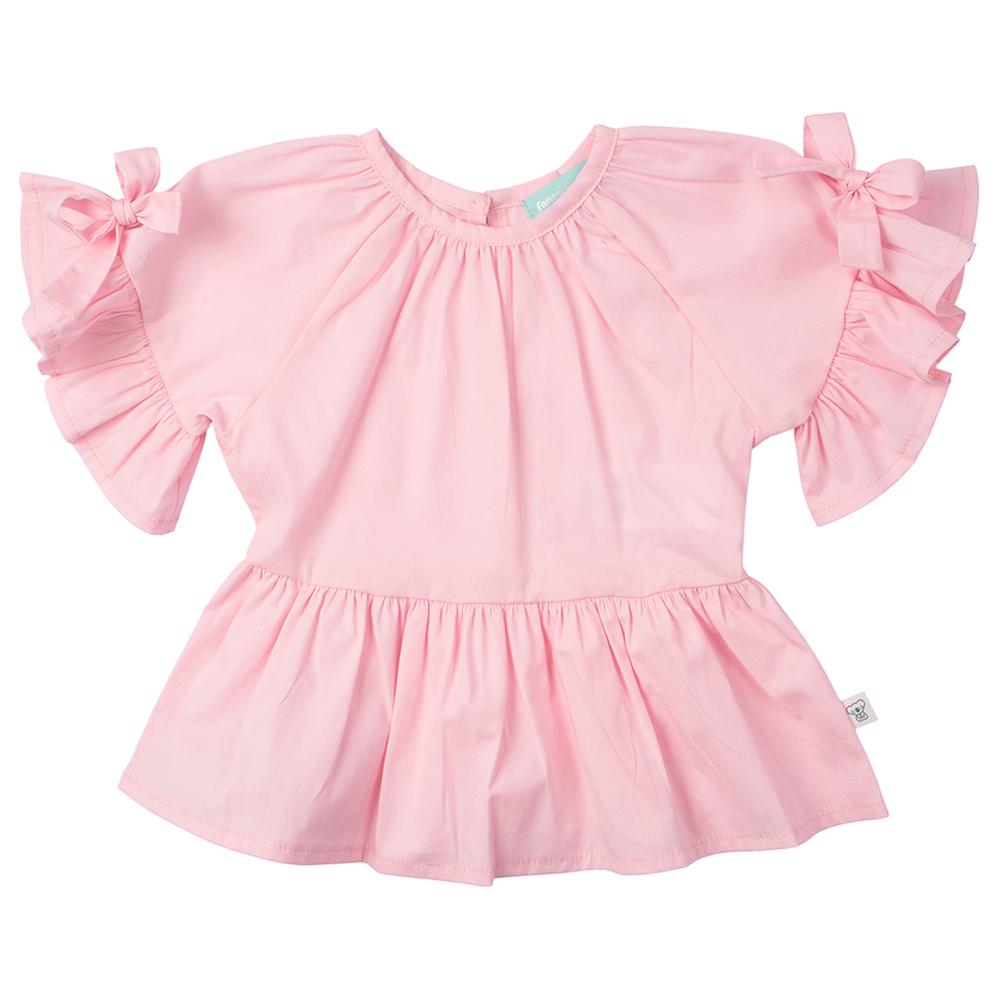 Esta blusa para bebé de diseño liso combina delicadeza y comodidad en una prenda ideal para el día a día o ocasiones especiales. Su cuello redondo y manga corta con detalle permiten libertad de movimiento, mientras que los olanes en mangas y ruedo aportan un toque femenino y elegante. El botón en la parte posterior facilita el ajuste y uso, haciendo de esta blusa una opción práctica y encantadora.