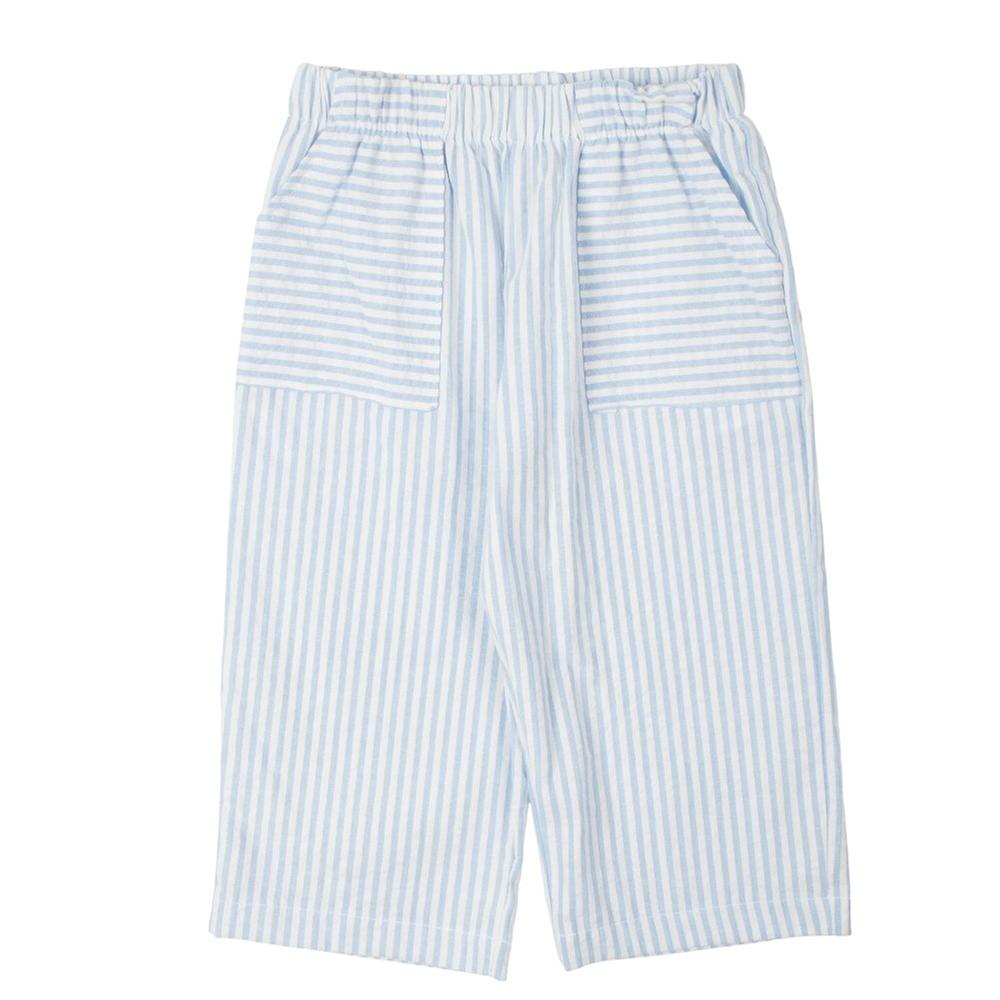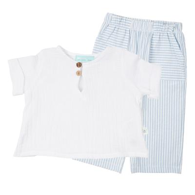 Este conjunto combina comodidad y estilo con su camisa blanca de manga corta y pantalón rayado. Los botones tipo madera aportan un toque tierno y moderno.