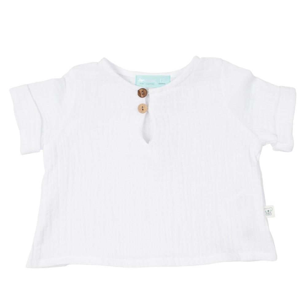 Atributos: Camisa manga corta color blanco Cuello con abertura en V Detalle de dos botones frontales estilo madera