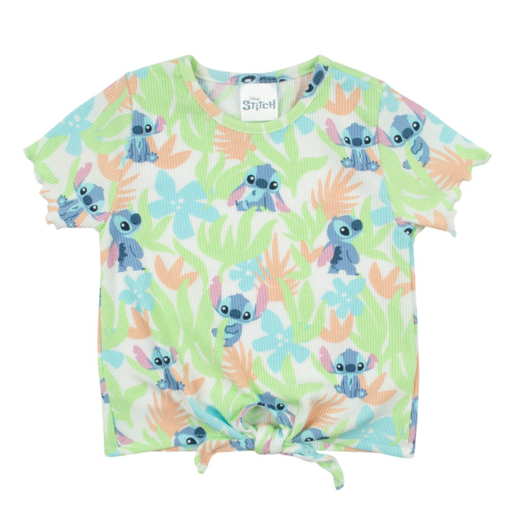 Playera: Cuello redondo, manga corta con olanes, amarre en ruedo, full print Stitch y hojas.