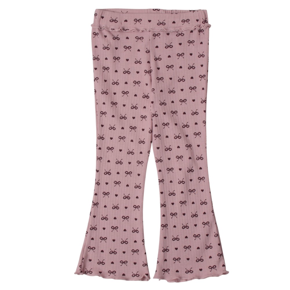 Pantalón con full print con diseño de moños, puños ondulados, cintura elástica y con detalles ondulados.