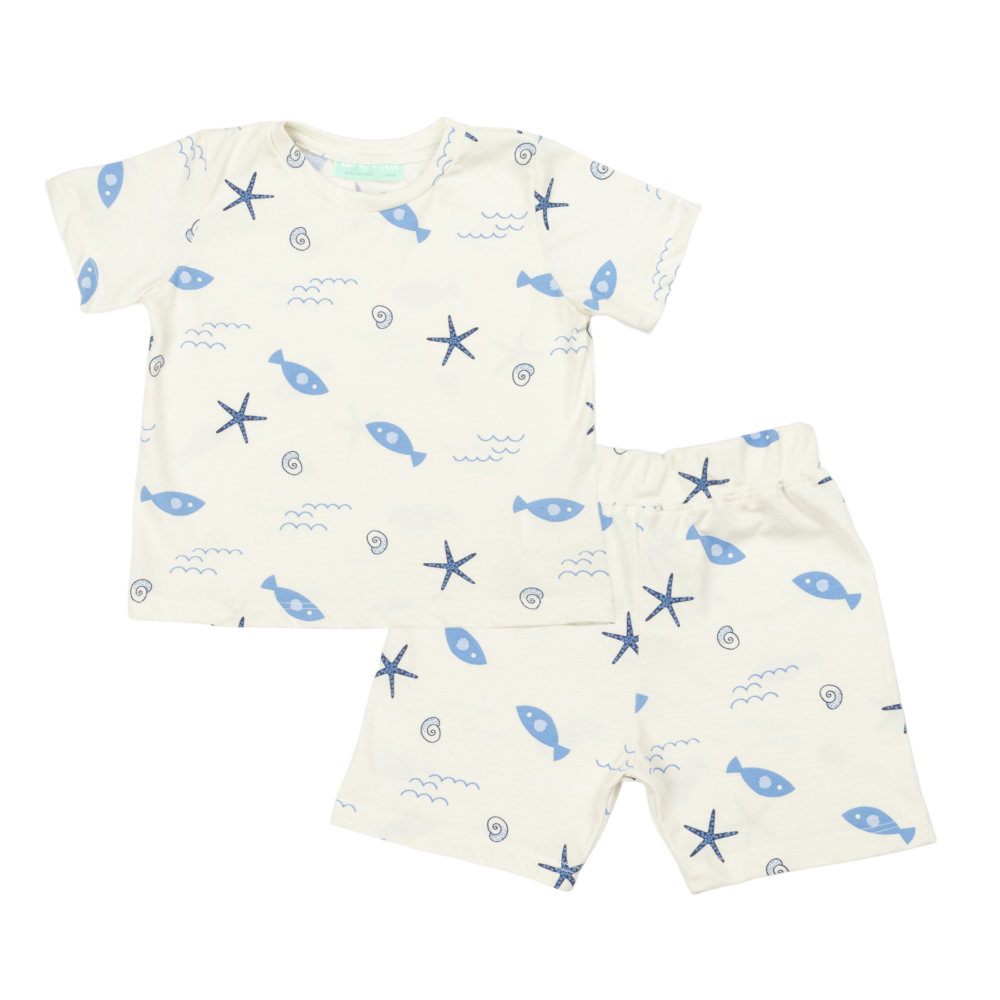Este conjunto de short y playera combina comodidad y estilo fresco, ideal para los días de verano o actividades al aire libre. Sus estampados con diseño acuático aportan un toque divertido y veraniego, mientras que la confección ligera permite libertad de movimiento y confort durante todo el día.