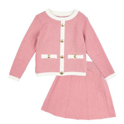 Conjunto para niña que incluye suéter con botones y falda, confeccionado 100% en algodón, ideal para brindar comodidad y estilo en cualquier ocasión. Perfecto para quienes buscan un look dulce y práctico.