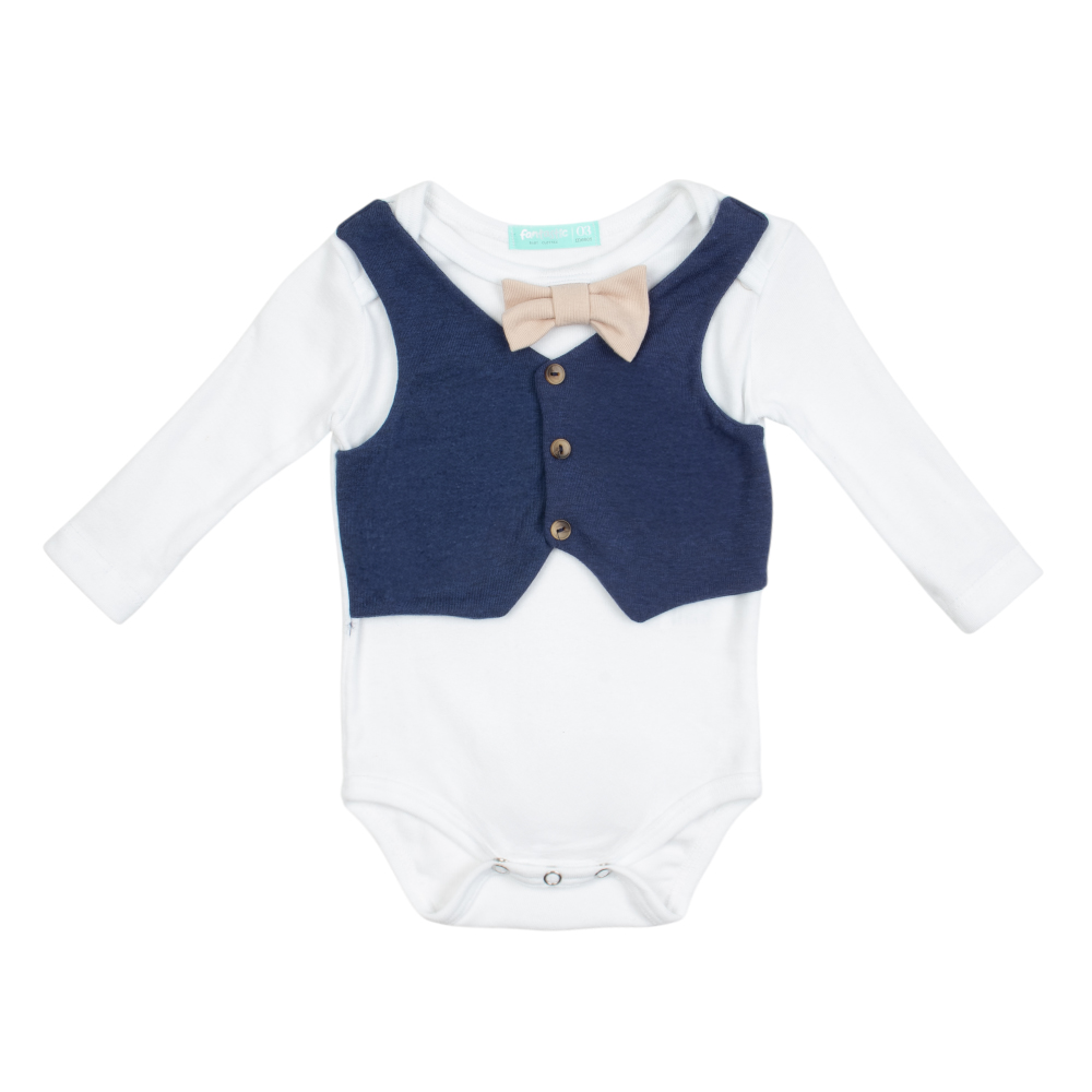 Pañalero con cuello redondo, manga larga, Chaleco simulado, botones en contraste, broches en piernas y moño en cuello