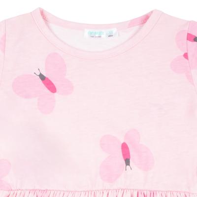 Vestido ligero y lleno de vida, con manga corta y estampado full print de mariposas que aportan frescura y alegría al look de tu bebé, perfecto para cualquier ocasión especial o día casual.