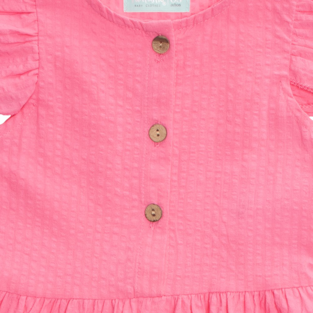 Tu bebé lucirá encantador con nuestro vestido con olanes en hombros. Incluye un cómodo cuello redondo, diseño sin mangas, prácticos botones en contraste y adorables olanes en hombros. ¡Este vestido es ideal para el día a día, ofreciendo estilo y máxima comodidad!