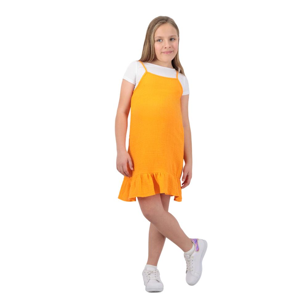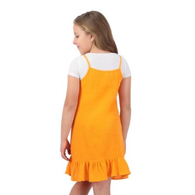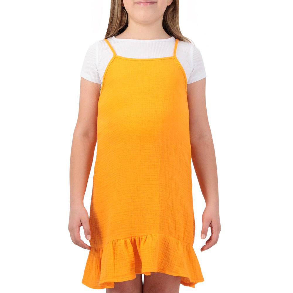 Este conjunto para niña, compuesto por vestido y playera de tirantes delgados, combina comodidad y estilo en un look fresco y moderno. El vestido con escote cuadrado y los tirantes delicados aportan elegancia ligera, mientras que la playera de manga corta con diseño acanalado añade un detalle divertido y texturizado. Ideal para que las pequeñas luzcan adorables y cómodas en cualquier ocasión.