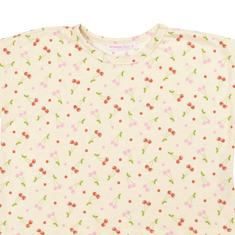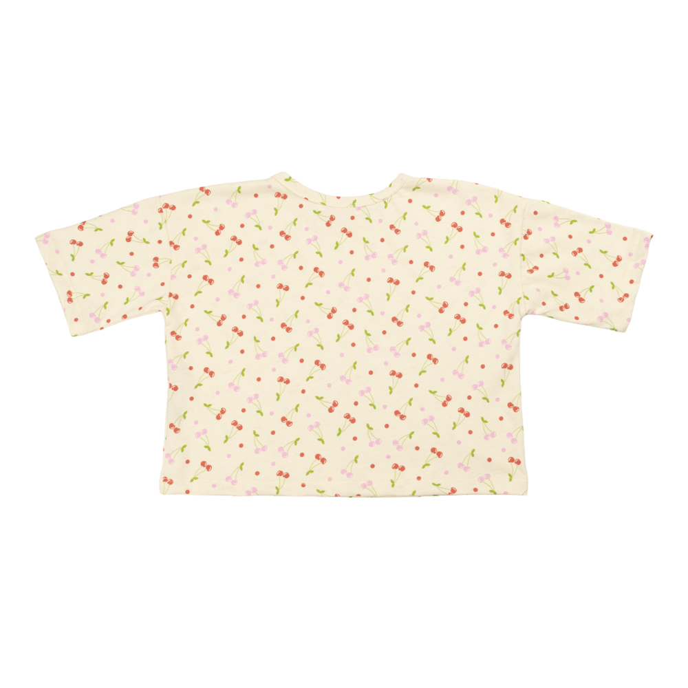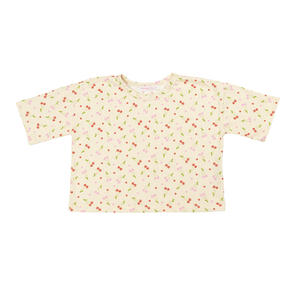 Playera con estampado full print de cerezas que aporta un estilo divertido y colorido. Su diseño vibrante destaca en cualquier conjunto casual, ofreciendo comodidad y personalidad.