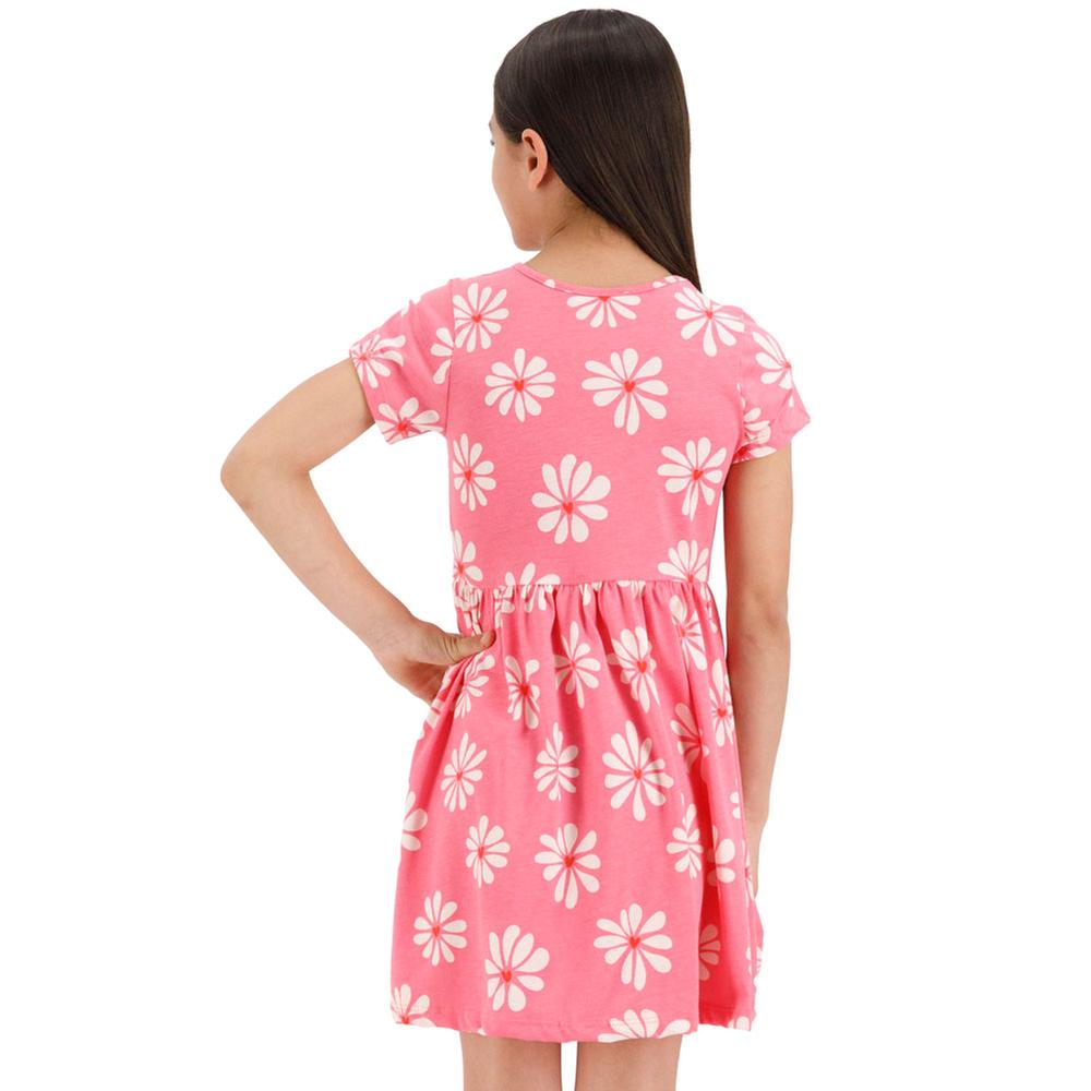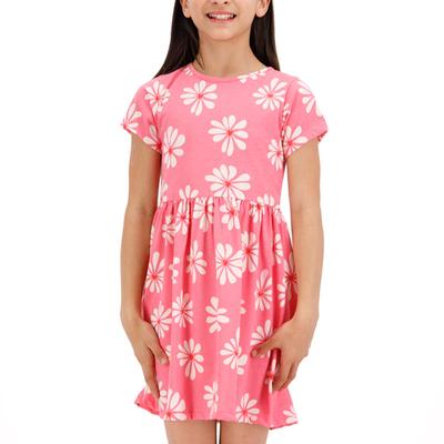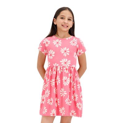 Vestido para niña de manga corta y cuello redondo con diseño full print de flores, ideal para un look fresco y alegre en cualquier ocasión. El ajuste en la cintura proporciona comodidad y un corte favorecedor, mientras que el estampado floral aporta un toque divertido y colorido. Una prenda versátil y encantadora, perfecta para días de juego o eventos casuales.