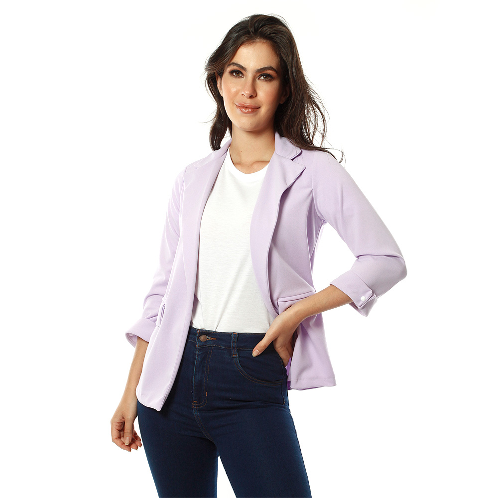 Saco básico con solapa, bolsas simuladas al frente y dobles en mangas con perla decorativa.