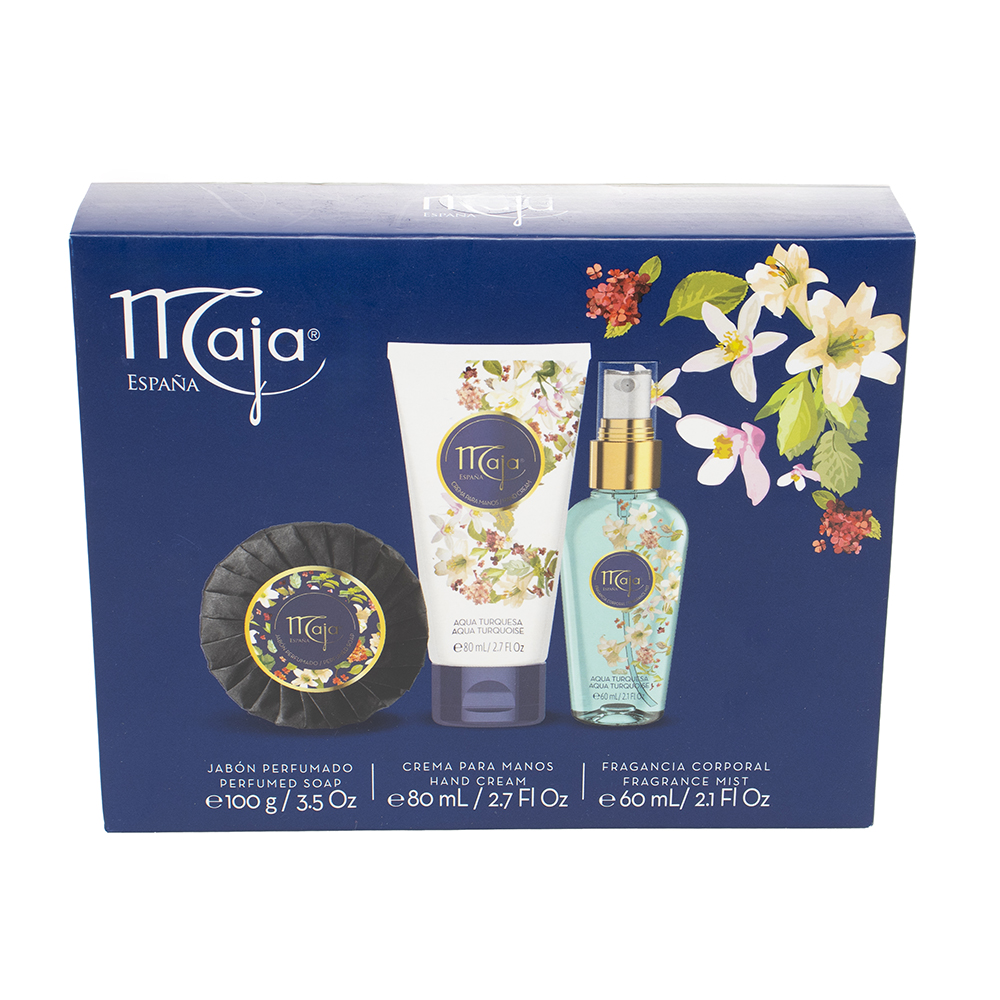 No dejes de lucir radiante a donde quiera que vayas con el set de viaje de la marca Maja. Gracias a su fórmula cítrica floral, enriquecida con aceites extraídos de las mejores y más bellas flores, obtén un aspecto reluciente todo el día. Lleva contigo su fantástico aroma Aqua Turquesa y consiente tu cuerpo las 24 horas. Es el complemento perfecto para tu rutina de higiene personal.
