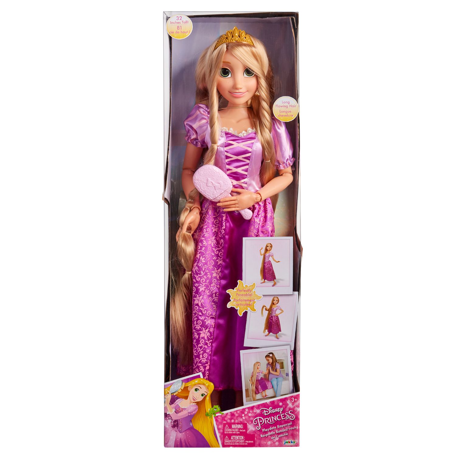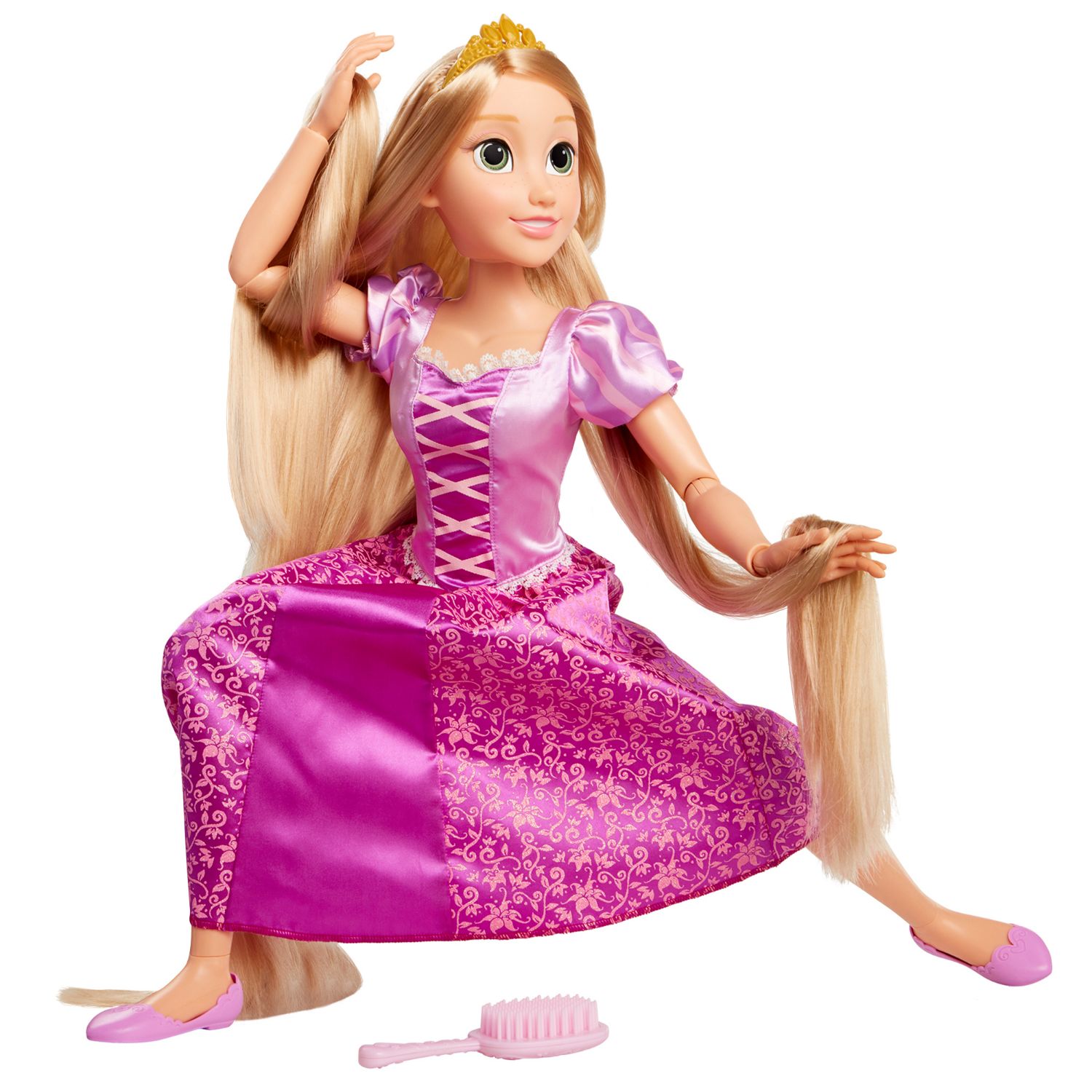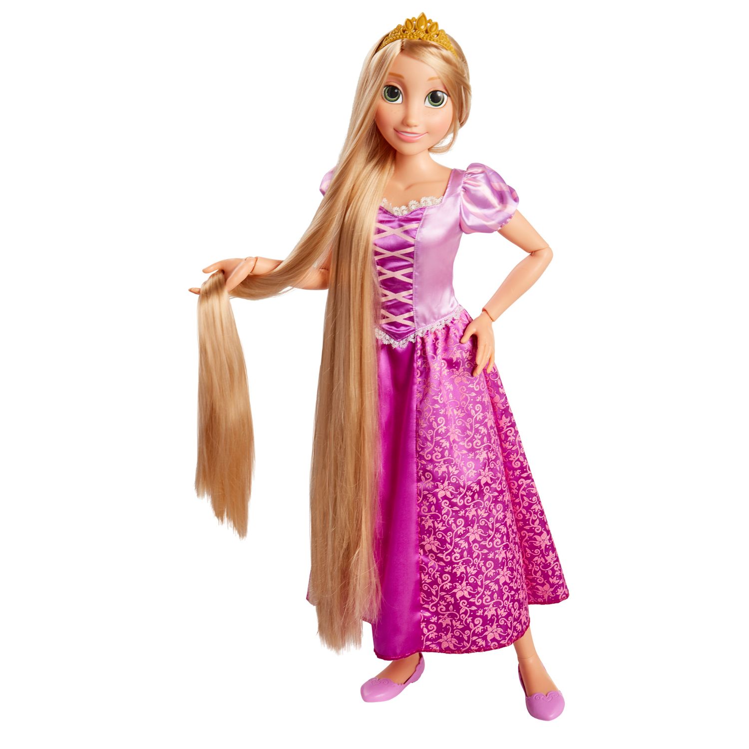 Ten el mejor día de juego con la Muñeca Gigante de Rapunzel. Inspirada en la película Enredados de Disney Princesas, está lista para ser tu mejor amiga por siempre. Mide 81.2cm de alto y tiene articulaciones en el cuello, hombros, codos, muñecas, cadera y rodillas, lo que le otorga perfectas poses para cualquier aventura. Puedes usar el cepillo para peinar su largo pelo dorado. Además, viene con su vestido morado, zapatos y corona para aún más diversión.