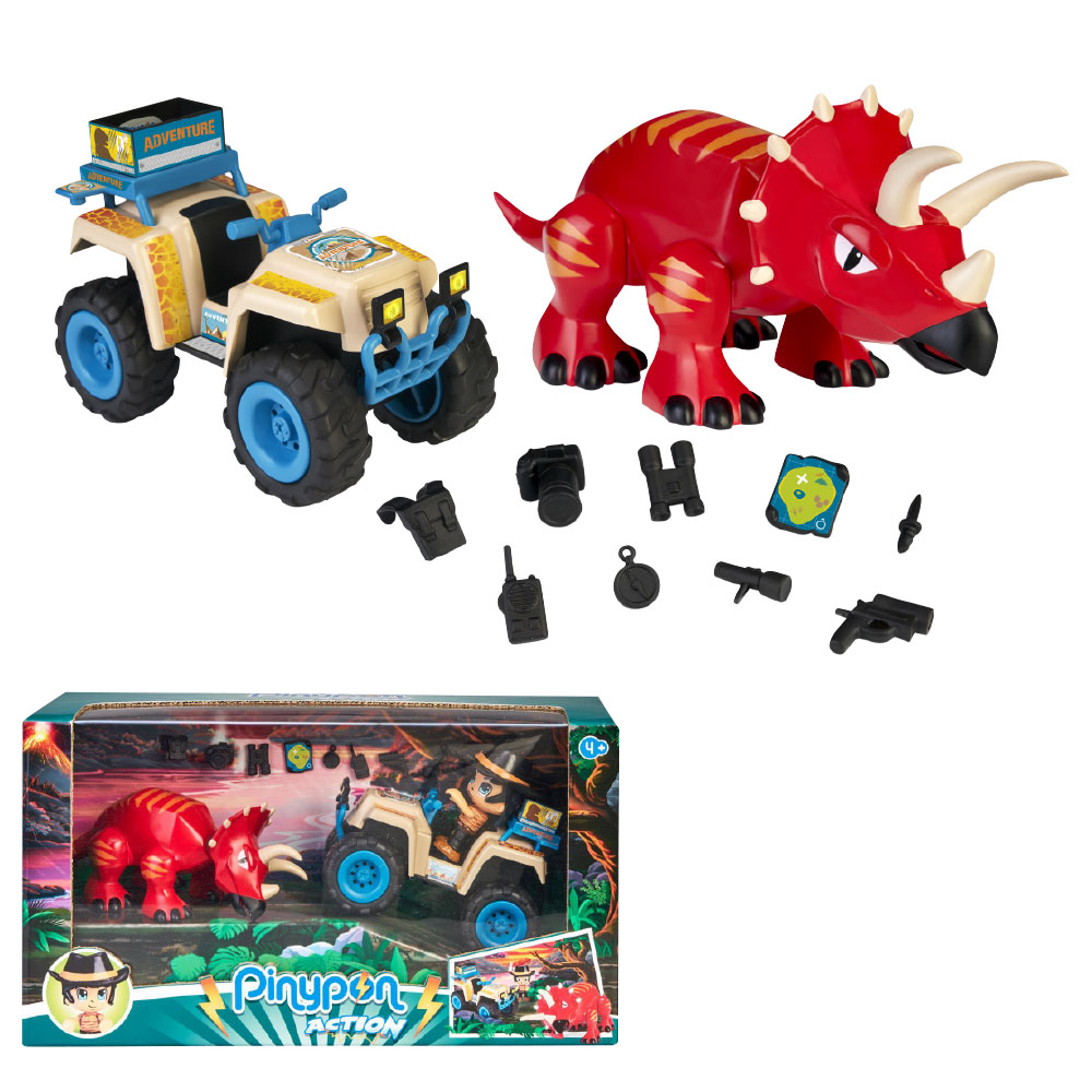 Crea extraordinarias combinaciones con este Set de Pinypon Action Wild Quad, incluye un dinosaurio para llevar toda la acción a donde quieras. El Styracosaurus cuenta con una gran cabeza para intercambiar con la figura de explorador incluida. Además, la cuatrimoto tiene una caja para guardar los pequeños accesorios que te ayudarán a recrear un sinfín de aventuras.